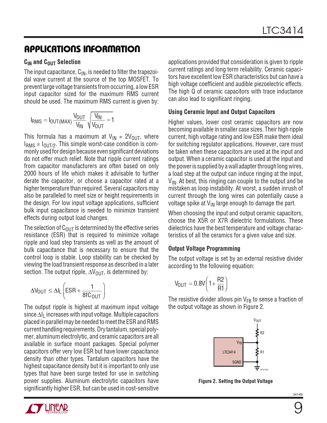 LTC3414 UUWUAPPLICATIO S I FOR ATIOCIN and COUT Selection applications provided that consideration is given to ripple The input capacitance, C current ratings and long term reliability. Ceramic capaci- IN, is needed to filter the trapezoi- dal wave current at the source of the top MOSFET. To tors have excellent low ESR characteristics but can have a prevent large voltage transients from occurring, a low ESR high voltage coefficient and audible piezoelectric effects. input capacitor sized for the maximum RMS current The high Q of ceramic capacitors with trace inductance should be used. The maximum RMS current is given by: can also lead to significant ringing. Using Ceramic Input and Output Capacitors V V I = I OUT IN RMS OUT MAX ( ) – 1 V V Higher values, lower cost ceramic capacitors are now IN OUT becoming available in smaller case sizes. Their high ripple This formula has a maximum at VIN = 2VOUT, where current, high voltage rating and low ESR make them ideal IRMS = IOUT/2. This simple worst-case condition is com- for switching regulator applications. However, care must monly used for design because even significant deviations be taken when these capacitors are used at the input and do not offer much relief. Note that ripple current ratings output. When a ceramic capacitor is used at the input and from capacitor manufacturers are often based on only the power is supplied by a wall adapter through long wires, 2000 hours of life which makes it advisable to further a load step at the output can induce ringing at the input, derate the capacitor, or choose a capacitor rated at a VIN. At best, this ringing can couple to the output and be higher temperature than required. Several capacitors may mistaken as loop instability. At worst, a sudden inrush of also be paralleled to meet size or height requirements in current through the long wires can potentially cause a the design. For low input voltage applications, sufficient voltage spike at VIN large enough to damage the part. bulk input capacitance is needed to minimize transient When choosing the input and output ceramic capacitors, effects during output load changes. choose the X5R or X7R dielectric formulations. These The selection of COUT is determined by the effective series dielectrics have the best temperature and voltage charac- resistance (ESR) that is required to minimize voltage teristics of all the ceramics for a given value and size. ripple and load step transients as well as the amount of bulk capacitance that is necessary to ensure that the Output Voltage Programming control loop is stable. Loop stability can be checked by The output voltage is set by an external resistive divider viewing the load transient response as described in a later according to the following equation: section. The output ripple, ΔVOUT, is determined by: ⎛ R2⎞ ⎛ ⎞ V 0. V OUT = 8 1+ Δ 1 ⎝⎜ ⎠⎟ V R1 OUT ≤ ΔI ESR L + ⎝⎜ fC 8 OUT ⎠⎟ The resistive divider allows pin VFB to sense a fraction of The output ripple is highest at maximum input voltage the output voltage as shown in Figure 2. since ΔIL increases with input voltage. Multiple capacitors placed in parallel may be needed to meet the ESR and RMS VOUT current handling requirements. Dry tantalum, special poly- R2 mer, aluminum electrolytic, and ceramic capacitors are all available in surface mount packages. Special polymer VFB capacitors offer very low ESR but have lower capacitance LTC3414 R1 density than other types. Tantalum capacitors have the SGND highest capacitance density but it is important to only use 3414 F02 types that have been surge tested for use in switching power supplies. Aluminum electrolytic capacitors have Figure 2. Setting the Output Voltage significantly higher ESR, but can be used in cost-sensitive 3414fb 9