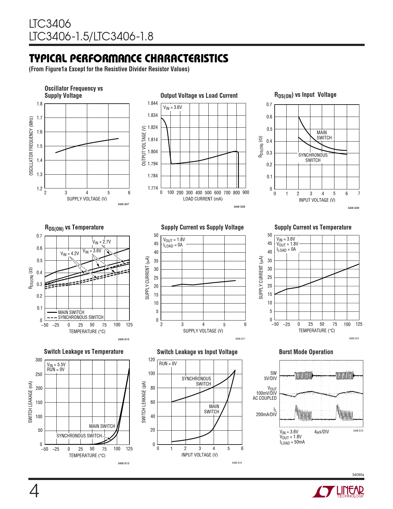 0.7 50 50 V V V OUT = 1.8V IN = 3.6V IN = 2.7V 45 I 45 V LOAD = 0A OUT = 1.8V 0.6 V I IN = 3.6V LOAD = 0A V 40 40 IN = 4.2V A) 0.5 A) µ 35 µ 35 ) Ω 30 30 ( 0.4 25 25 DS(ON) 0.3 R 20 20 0.2 15 15 SUPPLY CURRENT ( SUPPLY CURRENT ( 10 10 0.1 MAIN SWITCH 5 5 SYNCHRONOUS SWITCH 0 0 0 –50 –25 0 25 50 75 100 125 2 3 4 5 6 –50 –25 0 25 50 75 100 125 TEMPERATURE (°C) SUPPLY VOLTAGE (V) TEMPERATURE (°C) 3406 G10 3406 G11 3406 G12