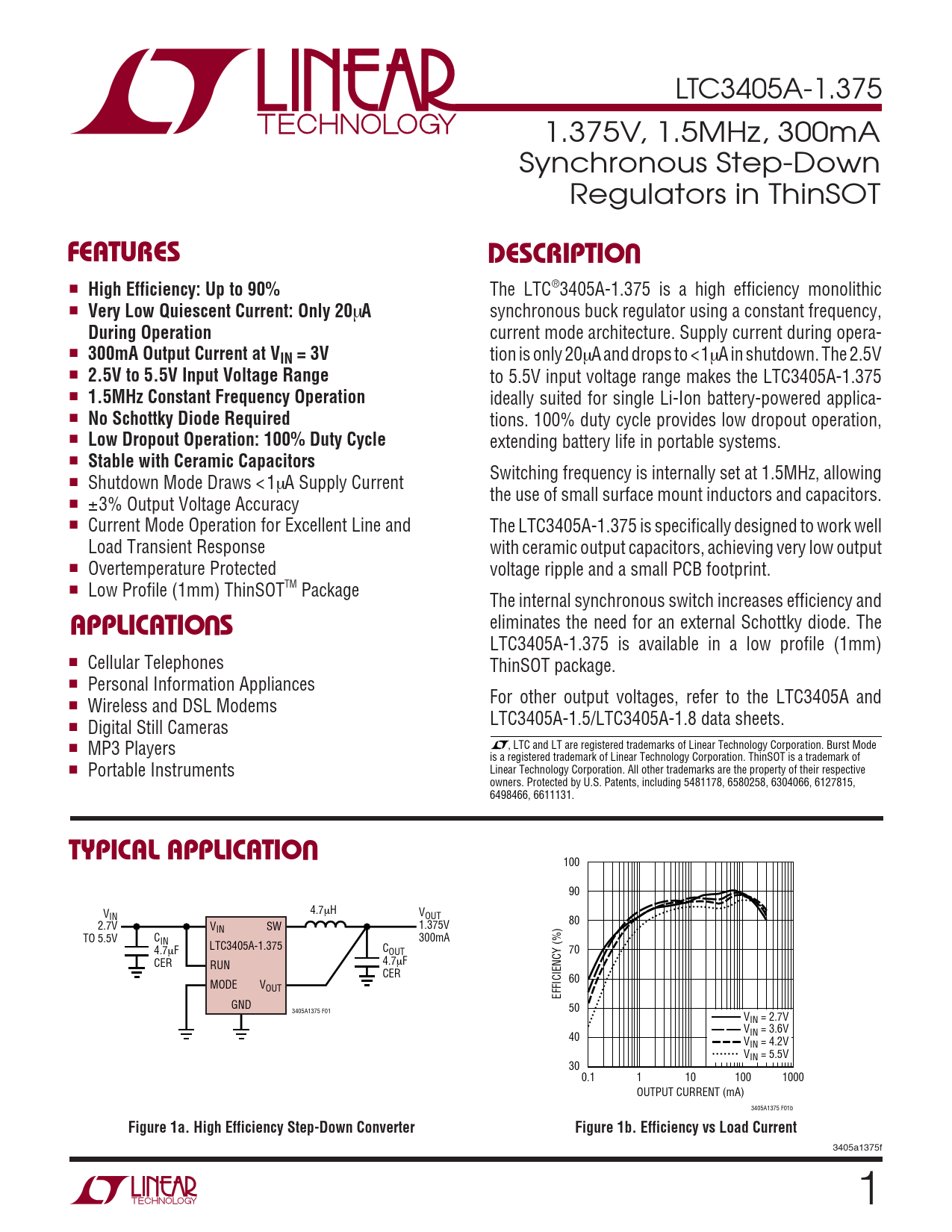 LTC3405A-1.375 is available in a low profile (1mm) ■ Cellular Telephones ThinSOT package. ■ Personal Information Appliances For other output voltages, refer to the LTC3405A and ■ Wireless and DSL Modems LTC3405A-1.5/LTC3405A-1.8 data sheets. ■ Digital Still Cameras , LTC and LT are registered trademarks of Linear Technology Corporation. Burst Mode ■ MP3 Players is a registered trademark of Linear Technology Corporation. ThinSOT is a trademark of ■ Linear Technology Corporation. All other trademarks are the property of their respective Portable Instruments owners. Protected by U.S. Patents, including 5481178, 6580258, 6304066, 6127815, 6498466, 6611131.