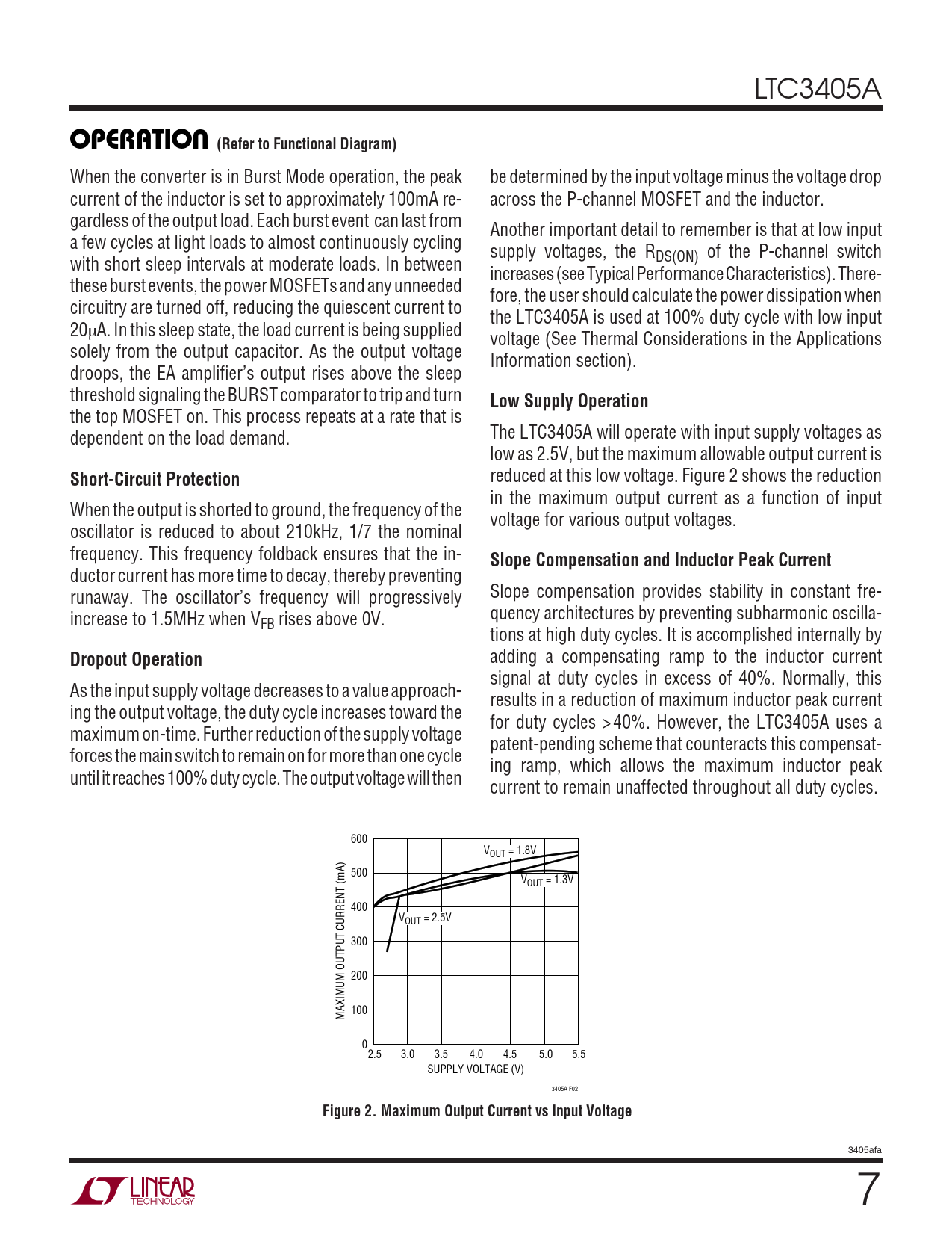 the top MOSFET on. This process repeats at a rate that is The LTC3405A will operate with input supply voltages as dependent on the load demand. low as 2.5V, but the maximum allowable output current is