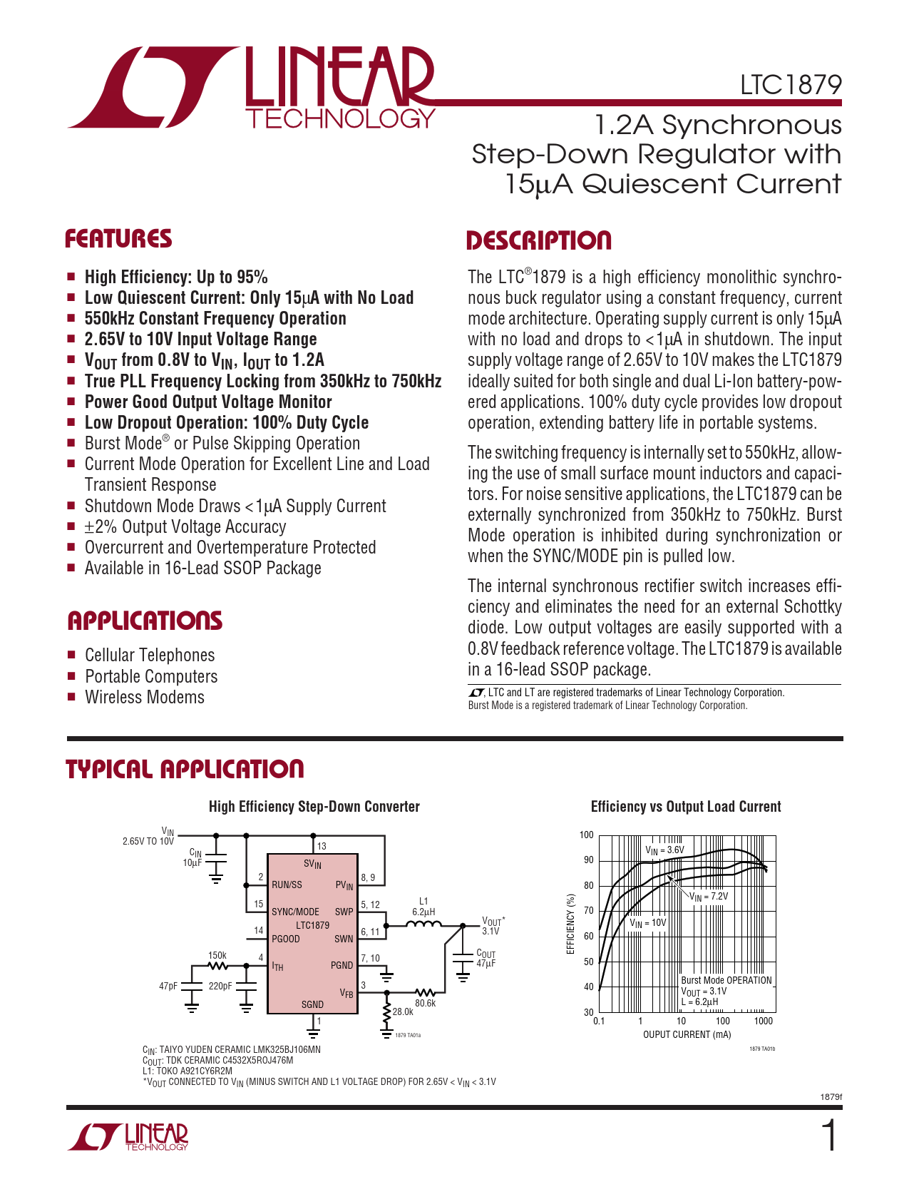 LTC1879 1.2A Synchronous Step-Down Regulator with 15µA Quiescent Current UFEATURESDESCRIPTIO ■ High Efficiency: Up to 95% The LTC®1879 is a high efficiency monolithic synchro- ■ Low Quiescent Current: Only 15 µ A with No Load nous buck regulator using a constant frequency, current ■ 550kHz Constant Frequency Operation mode architecture. Operating supply current is only 15µA ■ 2.65V to 10V Input Voltage Range with no load and drops to < 1µA in shutdown. The input ■ VOUT from 0.8V to VIN, IOUT to 1.2A supply voltage range of 2.65V to 10V makes the LTC1879 ■ True PLL Frequency Locking from 350kHz to 750kHz ideally suited for both single and dual Li-Ion battery-pow- ■ Power Good Output Voltage Monitor ered applications. 100% duty cycle provides low dropout ■ Low Dropout Operation: 100% Duty Cycle operation, extending battery life in portable systems. ■ Burst Mode® or Pulse Skipping Operation The switching frequency is internally set to 550kHz, allow- ■ Current Mode Operation for Excellent Line and Load ing the use of small surface mount inductors and capaci- Transient Response tors. For noise sensitive applications, the LTC1879 can be ■ Shutdown Mode Draws < 1µA Supply Current externally synchronized from 350kHz to 750kHz. Burst ■ ±2% Output Voltage Accuracy Mode operation is inhibited during synchronization or ■ Overcurrent and Overtemperature Protected when the SYNC/MODE pin is pulled low. ■ Available in 16-Lead SSOP Package The internal synchronous rectifier switch increases effi- U ciency and eliminates the need for an external Schottky APPLICATIO S diode. Low output voltages are easily supported with a ■ Cellular Telephones 0.8V feedback reference voltage. The LTC1879 is available in a 16-lead SSOP package. ■ Portable Computers ■ Wireless Modems , LTC and LT are registered trademarks of Linear Technology Corporation. Burst Mode is a registered trademark of Linear Technology Corporation. UTYPICAL APPLICATIOHigh Efficiency Step-Down ConverterEfficiency vs Output Load Current VIN 100 2.65V TO 10V 13 C V IN IN = 3.6V 10µF SV 90 IN 2 8, 9 RUN/SS PVIN 80 VIN = 7.2V 15 5, 12 L1 SYNC/MODE SWP 6.2µH 70 V LTC1879 OUT* VIN = 10V 14 6, 11 3.1V PGOOD SWN 60 EFFICIENCY (%) 150k C 4 7, 10 OUT I 47µF 50 TH PGND Burst Mode OPERATION 47pF 220pF 3 40 VFB VOUT = 3.1V SGND 80.6k L = 6.2µH 28.0k 30 1 0.1 1 10 100 1000 1879 TA01a OUPUT CURRENT (mA) CIN: TAIYO YUDEN CERAMIC LMK325BJ106MN 1879 TA01b COUT: TDK CERAMIC C4532X5ROJ476M L1: TOKO A921CY6R2M *VOUT CONNECTED TO VIN (MINUS SWITCH AND L1 VOLTAGE DROP) FOR 2.65V < VIN < 3.1V 1879f 1