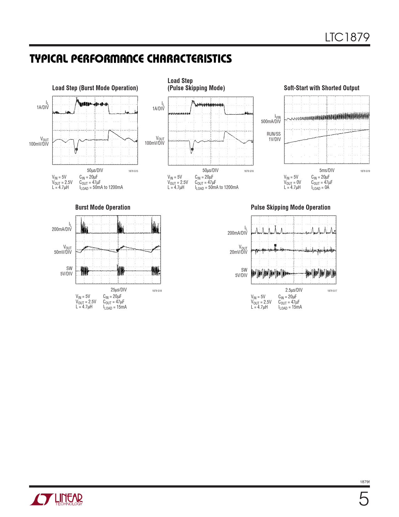 IL IL 1A/DIV 1A/DIV IVIN 500mA/DIV RUN/SS V V OUT OUT 1V/DIV 100mV/DIV 100mV/DIV 50µs/DIV 1879 G15 50µs/DIV 1879 G16 5ms/DIV 1879 G19 V V IN = 5V CIN = 20µF IN = 5V CIN = 20µF VIN = 5V CIN = 20µF V V OUT = 2.5V COUT = 47µF OUT = 2.5V COUT = 47µF VOUT = 0V COUT = 47µF L = 4.7µH I L = 4.7 LOAD = 50mA to 1200mA µH ILOAD = 50mA to 1200mA L = 4.7µH ILOAD = 0A