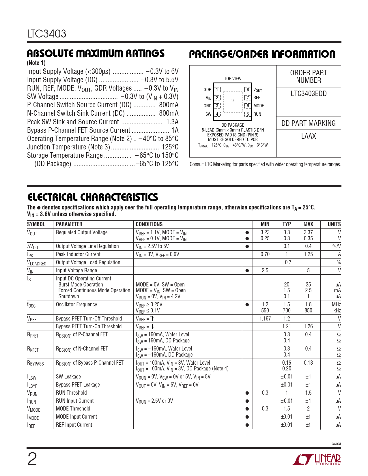 VOUT Regulated Output Voltage VREF = 1.1V, MODE = VIN ● 3.23 3.3 3.37 V VREF = 0.1V, MODE = VIN ● 0.25 0.3 0.35 V ∆VOUT Output Voltage Line Regulation VIN = 2.5V to 5V ● 0.1 0.4 %/V IPK Peak Inductor Current VIN = 3V, VREF = 0.9V 0.70 1 1.25 A VLOADREG Output Voltage Load Regulation 0.7 % VIN Input Voltage Range ● 2.5 5 V IS Input DC Operating Current Burst Mode Operation MODE = 0V, SW = Open 20 35 µA Forced Continuous Mode Operation MODE = VIN, SW = Open 1.5 2.5 mA Shutdown VRUN = 0V, VIN = 4.2V 0.1 1 µA fOSC Oscillator Frequency VREF ≥ 0.25V ● 1.2 1.5 1.8 MHz VREF ≤ 0.1V 550 700 850 kHz VREF Bypass PFET Turn-Off Threshold VREF = 1.167 1.2 V Bypass PFET Turn-On Threshold VREF = 1.21 1.26 V RPFET RDS(ON) of P-Channel FET ISW = 160mA, Wafer Level 0.3 0.4 Ω ISW = 160mA, DD Package 0.4 Ω RNFET RDS(ON) of N-Channel FET ISW = –160mA, Wafer Level 0.3 0.4 Ω ISW = –160mA, DD Package 0.4 Ω RBYPASS RDS(ON) of Bypass P-Channel FET IOUT = 100mA, VIN = 3V, Wafer Level 0.15 0.18 Ω IOUT = 100mA, VIN = 3V, DD Package (Note 4) 0.20 Ω ILSW SW Leakage VRUN = 0V, VSW = 0V or 5V, VIN = 5V ±0.01 ±1 µA ILBYP Bypass PFET Leakage VOUT = 0V, VIN = 5V, VREF = 0V ±0.01 ±1 µA VRUN RUN Threshold ● 0.3 1 1.5 V IRUN RUN Input Current VRUN = 2.5V or 0V ● ±0.01 ±1 µA VMODE MODE Threshold ● 0.3 1.5 2 V IMODE MODE Input Current ● ±0.01 ±1 µA IREF REF Input Current ● ±0.01 ±1 µA 3403f 2
