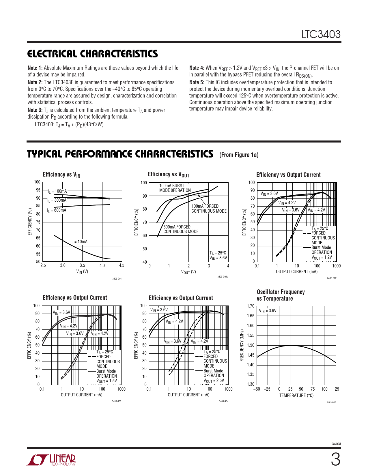 T temperature may impair device reliability. J is calculated from the ambient temperature TA and power dissipation PD according to the following formula: LTC3403: TJ = TA + (PD)(43°C/W)