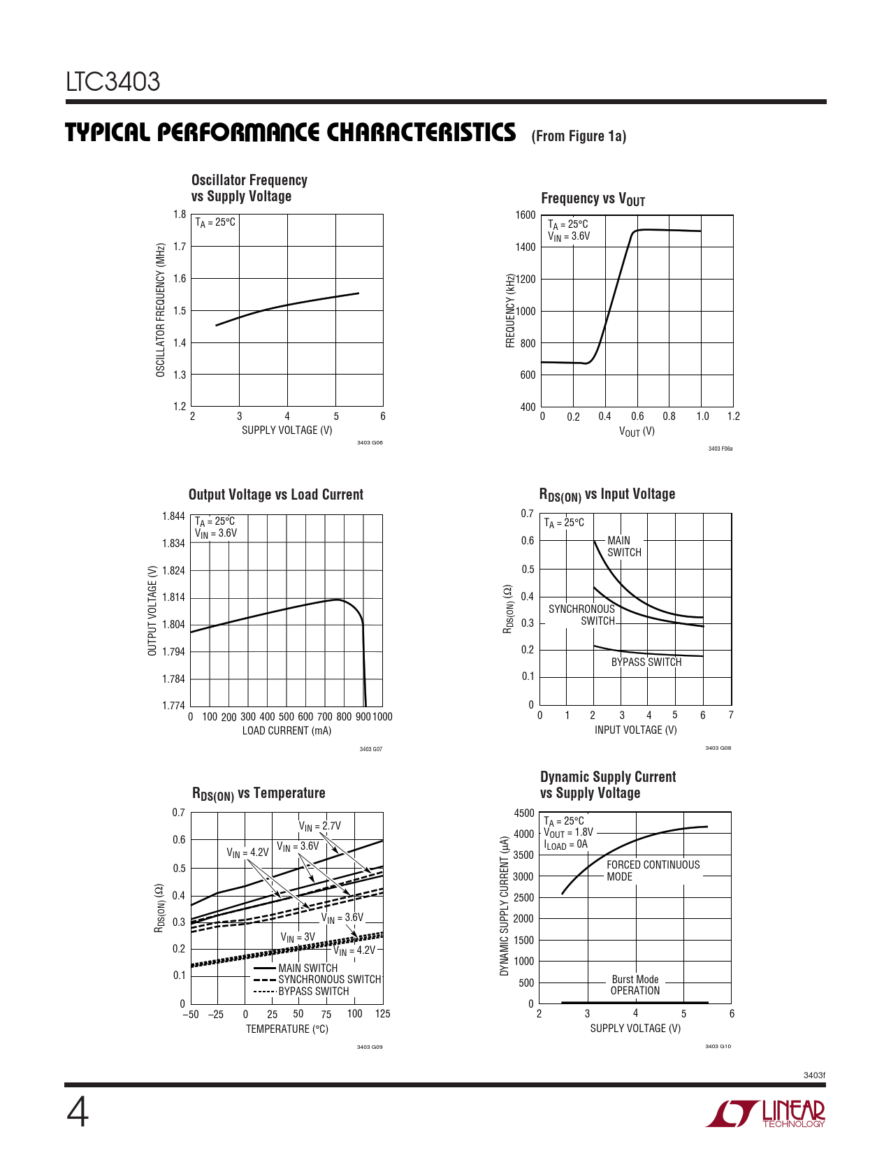 1.844 0.7 TA = 25°C TA = 25°C VIN = 3.6V 1.834 0.6 MAIN SWITCH 1.824 0.5 ) Ω 1.814 ( 0.4 SYNCHRONOUS 1.804 DS(ON) 0.3 SWITCH R OUTPUT VOLTAGE (V) 1.794 0.2 BYPASS SWITCH 1.784 0.1 1.774 0 0 100 200 300 400 500 600 700 800 900 1000 0 1 2 3 4 5 6 7 LOAD CURRENT (mA) INPUT VOLTAGE (V) 3403 G07 3403 G08