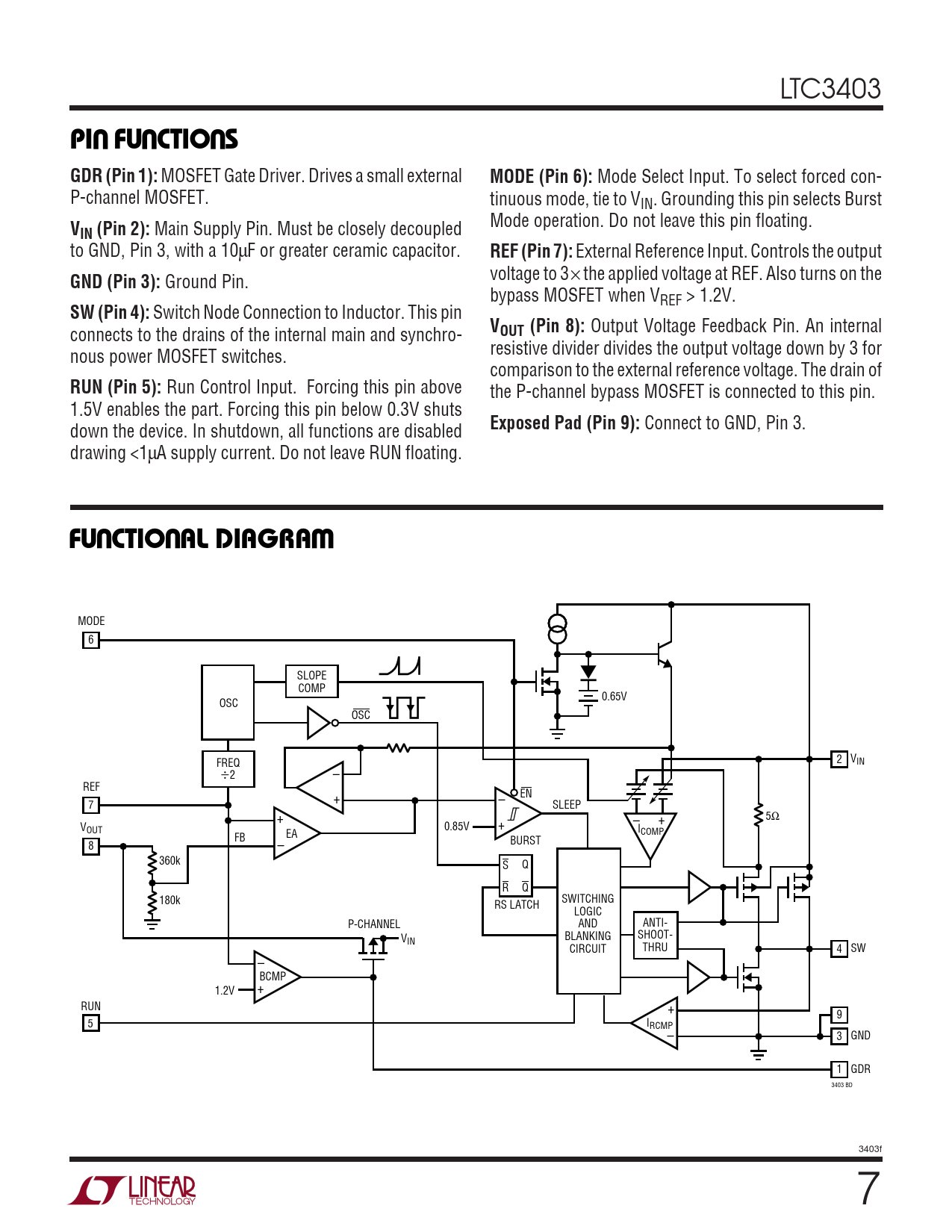 MODE 6 SLOPE COMP 0.65V OSC OSC FREQ 2 VIN ÷2 – REF + – EN 7 SLEEP + 5Ω V 0.85V + – + OUT ICOMP FB – EA BURST 8 360k S Q R Q 180k SWITCHING RS LATCH LOGIC P-CHANNEL AND ANTI- BLANKING SHOOT- VIN CIRCUIT THRU 4 SW – BCMP 1.2V + + RUN 9 5 IRCMP– 3 GND 1 GDR 3403 BD 3403f 7