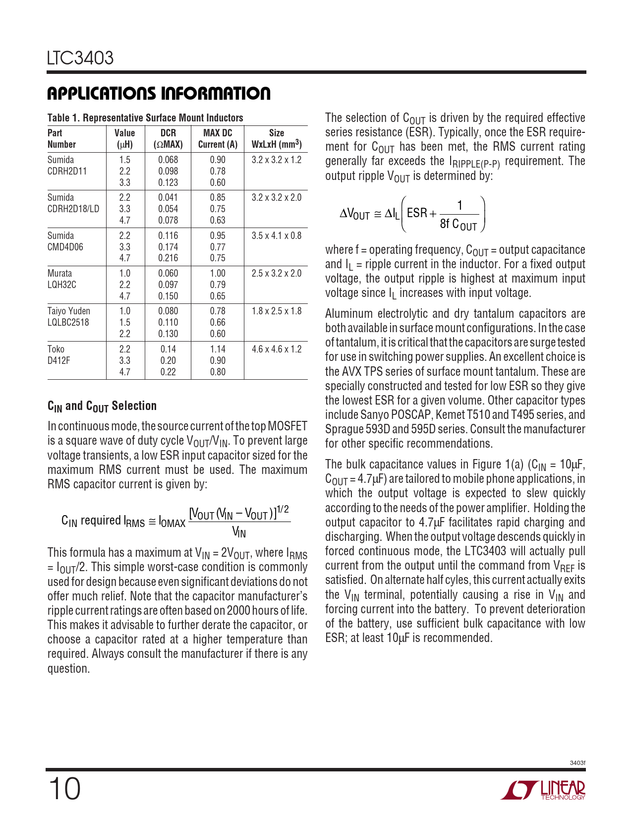 LTC3403 UUWUAPPLICATIO S I FOR ATIOTable 1. Representative Surface Mount Inductors The selection of COUT is driven by the required effective PartValueDCRMAX DCSize series resistance (ESR). Typically, once the ESR require- Number( µ H)( Ω MAX)Current (A)WxLxH (mm3) ment for COUT has been met, the RMS current rating Sumida 1.5 0.068 0.90 3.2 x 3.2 x 1.2 generally far exceeds the IRIPPLE(P-P) requirement. The CDRH2D11 2.2 0.098 0.78 output ripple V 3.3 0.123 0.60 OUT is determined by: Sumida 2.2 0.041 0.85 3.2 x 3.2 x 2.0 1 CDRH2D18/LD 3.3 0.054 0.75 ∆VOUT ≅ ∆I ESR L + 4.7 0.078 0.63 f 8 COUT Sumida 2.2 0.116 0.95 3.5 x 4.1 x 0.8 CMD4D06 3.3 0.174 0.77 where f = operating frequency, COUT = output capacitance 4.7 0.216 0.75 and IL = ripple current in the inductor. For a fixed output Murata 1.0 0.060 1.00 2.5 x 3.2 x 2.0 voltage, the output ripple is highest at maximum input LQH32C 2.2 0.097 0.79 4.7 0.150 0.65 voltage since IL increases with input voltage. Taiyo Yuden 1.0 0.080 0.78 1.8 x 2.5 x 1.8 Aluminum electrolytic and dry tantalum capacitors are LQLBC2518 1.5 0.110 0.66 both available in surface mount configurations. In the case 2.2 0.130 0.60 of tantalum, it is critical that the capacitors are surge tested Toko 2.2 0.14 1.14 4.6 x 4.6 x 1.2 D412F 3.3 0.20 0.90 for use in switching power supplies. An excellent choice is 4.7 0.22 0.80 the AVX TPS series of surface mount tantalum. These are specially constructed and tested for low ESR so they give C the lowest ESR for a given volume. Other capacitor types IN and COUT Selection include Sanyo POSCAP, Kemet T510 and T495 series, and In continuous mode, the source current of the top MOSFET Sprague 593D and 595D series. Consult the manufacturer is a square wave of duty cycle VOUT/VIN. To prevent large for other specific recommendations. voltage transients, a low ESR input capacitor sized for the maximum RMS current must be used. The maximum The bulk capacitance values in Figure 1(a) (CIN = 10µF, RMS capacitor current is given by: COUT = 4.7µF) are tailored to mobile phone applications, in which the output voltage is expected to slew quickly V V V according to the needs of the power amplifier. Holding the C required I ≅ [ ( – )] / 1 2 I OUT IN OUT IN RMS OMAX output capacitor to 4.7µF facilitates rapid charging and VIN discharging. When the output voltage descends quickly in This formula has a maximum at V forced continuous mode, the LTC3403 will actually pull IN = 2VOUT, where IRMS = I current from the output until the command from V OUT/2. This simple worst-case condition is commonly REF is used for design because even significant deviations do not satisfied. On alternate half cyles, this current actually exits offer much relief. Note that the capacitor manufacturer’s the VIN terminal, potentially causing a rise in VIN and ripple current ratings are often based on 2000 hours of life. forcing current into the battery. To prevent deterioration This makes it advisable to further derate the capacitor, or of the battery, use sufficient bulk capacitance with low choose a capacitor rated at a higher temperature than ESR; at least 10µF is recommended. required. Always consult the manufacturer if there is any question. 3403f 10