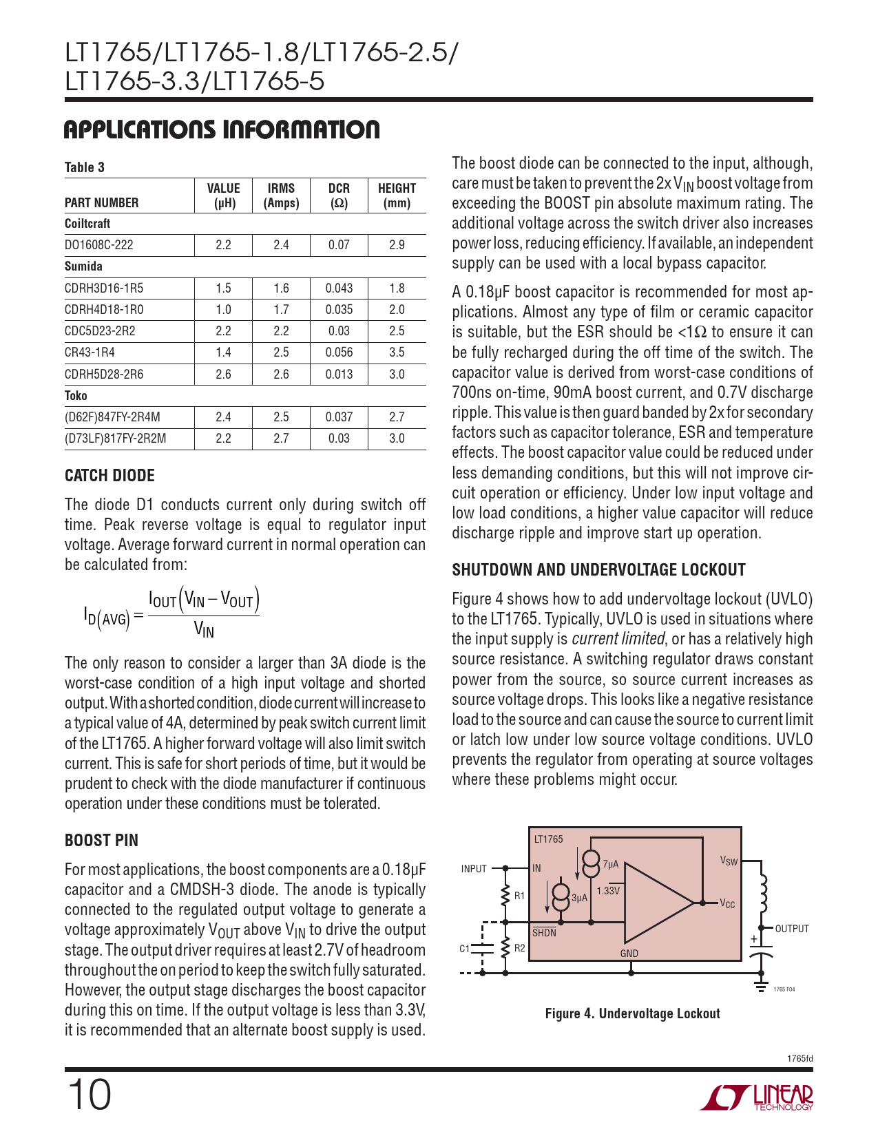 LT1765/LT1765-1.8/LT1765-2.5/ LT1765-3.3/LT1765-5 APPLICATIONS INFORMATIONTable 3 The boost diode can be connected to the input, although, VALUEIRMSDCRHEIGHT care must be taken to prevent the 2x VIN boost voltage from PART NUMBER(μH)(Amps)(Ω)(mm) exceeding the BOOST pin absolute maximum rating. The Coiltcraft additional voltage across the switch driver also increases DO1608C-222 2.2 2.4 0.07 2.9 power loss, reducing effi ciency. If available, an independent Sumida supply can be used with a local bypass capacitor. CDRH3D16-1R5 1.5 1.6 0.043 1.8 A 0.18μF boost capacitor is recommended for most ap- CDRH4D18-1R0 1.0 1.7 0.035 2.0 plications. Almost any type of fi lm or ceramic capacitor CDC5D23-2R2 2.2 2.2 0.03 2.5 is suitable, but the ESR should be <1Ω to ensure it can CR43-1R4 1.4 2.5 0.056 3.5 be fully recharged during the off time of the switch. The CDRH5D28-2R6 2.6 2.6 0.013 3.0 capacitor value is derived from worst-case conditions of Toko 700ns on-time, 90mA boost current, and 0.7V discharge (D62F)847FY-2R4M 2.4 2.5 0.037 2.7 ripple. This value is then guard banded by 2x for secondary (D73LF)817FY-2R2M 2.2 2.7 0.03 3.0 factors such as capacitor tolerance, ESR and temperature effects. The boost capacitor value could be reduced under CATCH DIODE less demanding conditions, but this will not improve cir- cuit operation or effi ciency. Under low input voltage and The diode D1 conducts current only during switch off low load conditions, a higher value capacitor will reduce time. Peak reverse voltage is equal to regulator input discharge ripple and improve start up operation. voltage. Average forward current in normal operation can be calculated from: SHUTDOWN AND UNDERVOLTAGE LOCKOUT I V − V OUT IN OUT ( ) Figure 4 shows how to add undervoltage lockout (UVLO) ID AVG ( ) = to the LT1765. Typically, UVLO is used in situations where VIN the input supply is current limited, or has a relatively high The only reason to consider a larger than 3A diode is the source resistance. A switching regulator draws constant worst-case condition of a high input voltage and shorted power from the source, so source current increases as output. With a shorted condition, diode current will increase to source voltage drops. This looks like a negative resistance a typical value of 4A, determined by peak switch current limit load to the source and can cause the source to current limit of the LT1765. A higher forward voltage will also limit switch or latch low under low source voltage conditions. UVLO current. This is safe for short periods of time, but it would be prevents the regulator from operating at source voltages prudent to check with the diode manufacturer if continuous where these problems might occur. operation under these conditions must be tolerated. BOOST PIN LT1765 V For most applications, the boost components are a 0.18μF SW INPUT IN 7μA capacitor and a CMDSH-3 diode. The anode is typically 1.33V R1 3μA connected to the regulated output voltage to generate a VCC voltage approximately VOUT above VIN to drive the output OUTPUT SHDN + stage. The output driver requires at least 2.7V of headroom C1 R2 GND throughout the on period to keep the switch fully saturated. However, the output stage discharges the boost capacitor 1765 F04 during this on time. If the output voltage is less than 3.3V, Figure 4. Undervoltage Lockout it is recommended that an alternate boost supply is used. 1765fd 10