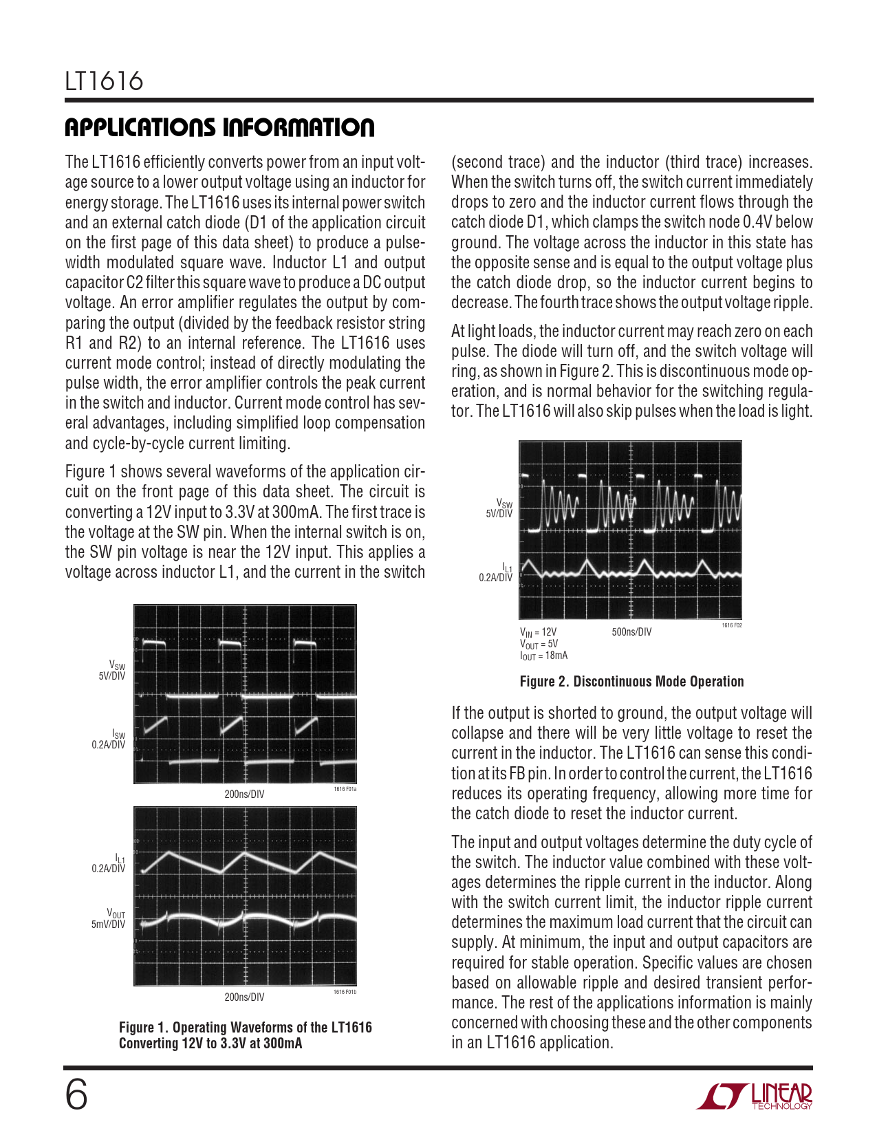 LT1616 UUWUAPPLICATIO S I FOR ATIO The LT1616 efficiently converts power from an input volt- (second trace) and the inductor (third trace) increases. age source to a lower output voltage using an inductor for When the switch turns off, the switch current immediately energy storage. The LT1616 uses its internal power switch drops to zero and the inductor current flows through the and an external catch diode (D1 of the application circuit catch diode D1, which clamps the switch node 0.4V below on the first page of this data sheet) to produce a pulse- ground. The voltage across the inductor in this state has width modulated square wave. Inductor L1 and output the opposite sense and is equal to the output voltage plus capacitor C2 filter this square wave to produce a DC output the catch diode drop, so the inductor current begins to voltage. An error amplifier regulates the output by com- decrease. The fourth trace shows the output voltage ripple. paring the output (divided by the feedback resistor string At light loads, the inductor current may reach zero on each R1 and R2) to an internal reference. The LT1616 uses pulse. The diode will turn off, and the switch voltage will current mode control; instead of directly modulating the ring, as shown in Figure 2. This is discontinuous mode op- pulse width, the error amplifier controls the peak current eration, and is normal behavior for the switching regula- in the switch and inductor. Current mode control has sev- tor. The LT1616 will also skip pulses when the load is light. eral advantages, including simplified loop compensation and cycle-by-cycle current limiting. Figure 1 shows several waveforms of the application cir- cuit on the front page of this data sheet. The circuit is V converting a 12V input to 3.3V at 300mA. The first trace is SW 5V/DIV the voltage at the SW pin. When the internal switch is on, the SW pin voltage is near the 12V input. This applies a voltage across inductor L1, and the current in the switch IL1 0.2A/DIV 1616 F02 VIN = 12V 500ns/DIV VOUT = 5V IOUT = 18mA VSW 5V/DIV Figure 2. Discontinuous Mode Operation If the output is shorted to ground, the output voltage will ISW collapse and there will be very little voltage to reset the 0.2A/DIV current in the inductor. The LT1616 can sense this condi- tion at its FB pin. In order to control the current, the LT1616 1616 F01a 200ns/DIV reduces its operating frequency, allowing more time for the catch diode to reset the inductor current. The input and output voltages determine the duty cycle of IL1 the switch. The inductor value combined with these volt- 0.2A/DIV ages determines the ripple current in the inductor. Along with the switch current limit, the inductor ripple current VOUT 5mV/DIV determines the maximum load current that the circuit can supply. At minimum, the input and output capacitors are required for stable operation. Specific values are chosen based on allowable ripple and desired transient perfor- 1616 F01b 200ns/DIV mance. The rest of the applications information is mainly Figure 1. Operating Waveforms of the LT1616 concerned with choosing these and the other components Converting 12V to 3.3V at 300mA in an LT1616 application. 6