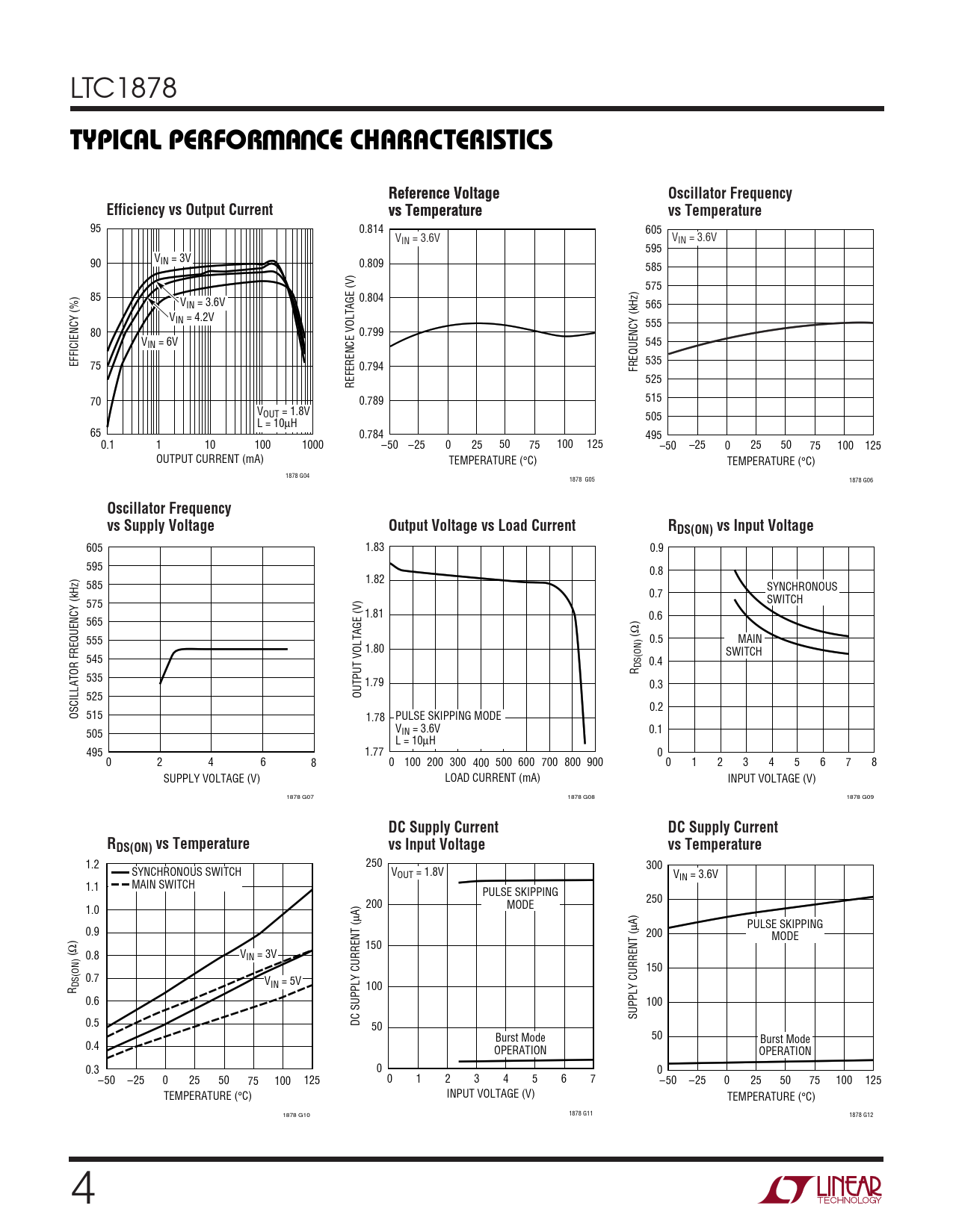 605 1.83 0.9 595 0.8 1.82 585 SYNCHRONOUS 0.7 575 SWITCH 1.81 0.6 565 ) Ω ( 555 0.5 MAIN 1.80 SWITCH 545 DS(ON) 0.4 R 535 1.79 0.3 525 OUTPUT VOLTAGE (V) 0.2 OSCILLATOR FREQUENCY (kHz) 515 1.78 PULSE SKIPPING MODE V 505 IN = 3.6V 0.1 L = 10µH 495 1.77 0 0 2 4 6 8 0 100 200 300 400 500 600 700 800 900 0 1 2 3 4 5 6 7 8 SUPPLY VOLTAGE (V) LOAD CURRENT (mA) INPUT VOLTAGE (V) 1878 G07 1878 G08 1878 G09