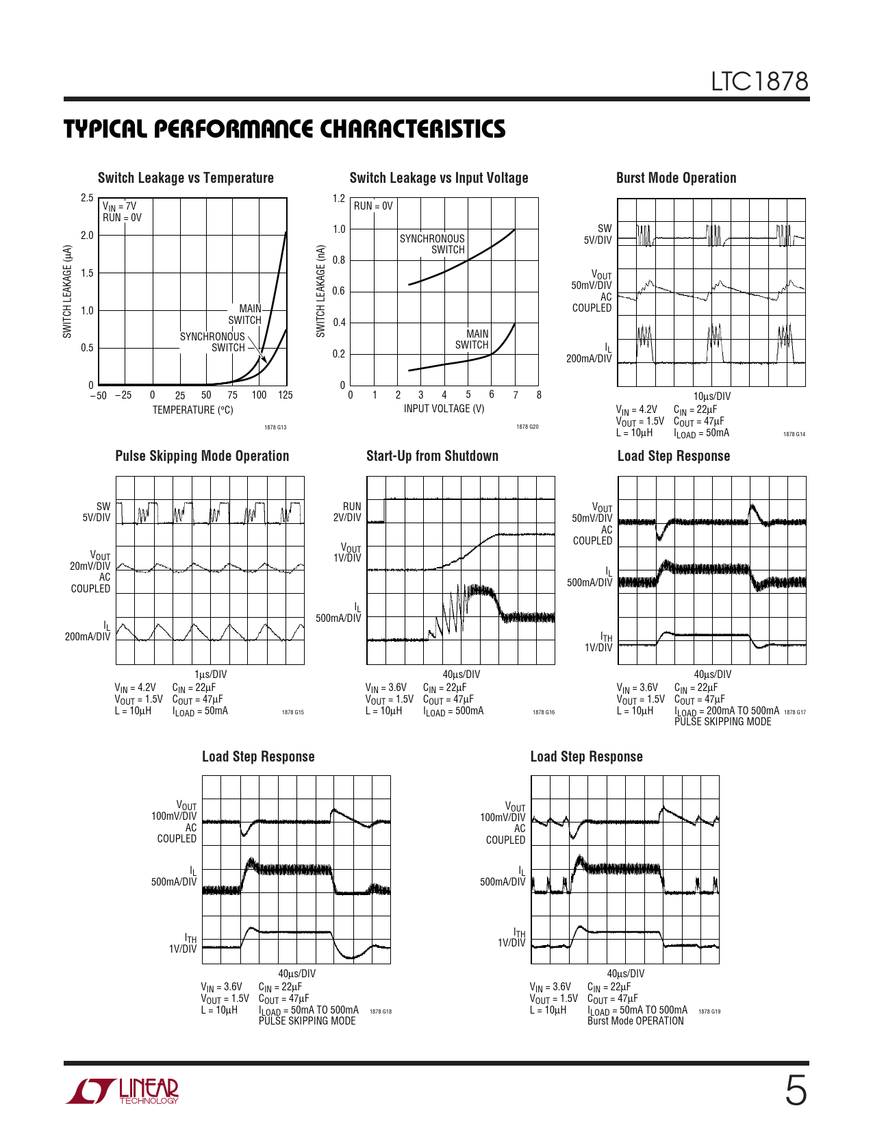 SW RUN VOUT 5V/DIV 2V/DIV 50mV/DIV AC COUPLED VOUT VOUT 1V/DIV 20mV/DIV I AC L 500mA/DIV COUPLED IL 500mA/DIV IL 200mA/DIV ITH 1V/DIV 1µs/DIV 40µs/DIV 40µs/DIV VIN = 4.2V CIN = 22µF VIN = 3.6V CIN = 22µF VIN = 3.6V CIN = 22µF VOUT = 1.5V COUT = 47µF VOUT = 1.5V COUT = 47µF VOUT = 1.5V COUT = 47µF L = 10µH ILOAD = 50mA 1878 G15 L = 10µH ILOAD = 500mA 1878 G16 L = 10µH ILOAD = 200mA TO 500mA 1878 G17 PULSE SKIPPING MODE