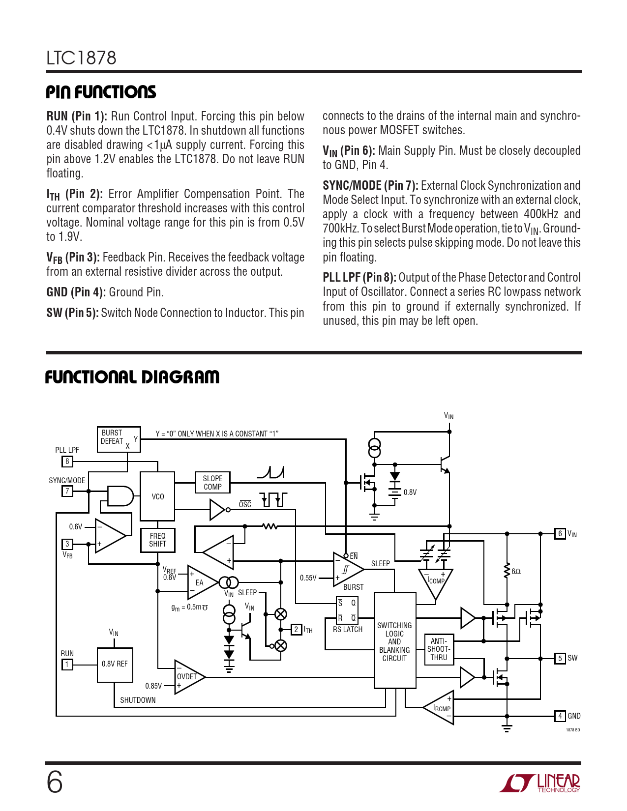 Pages / Page16 / 6 — PI FU CTIO S. RUN (Pin 1):. IN (Pin 6):. SYNC/MODE (Pin 7):. ITH (Pin …