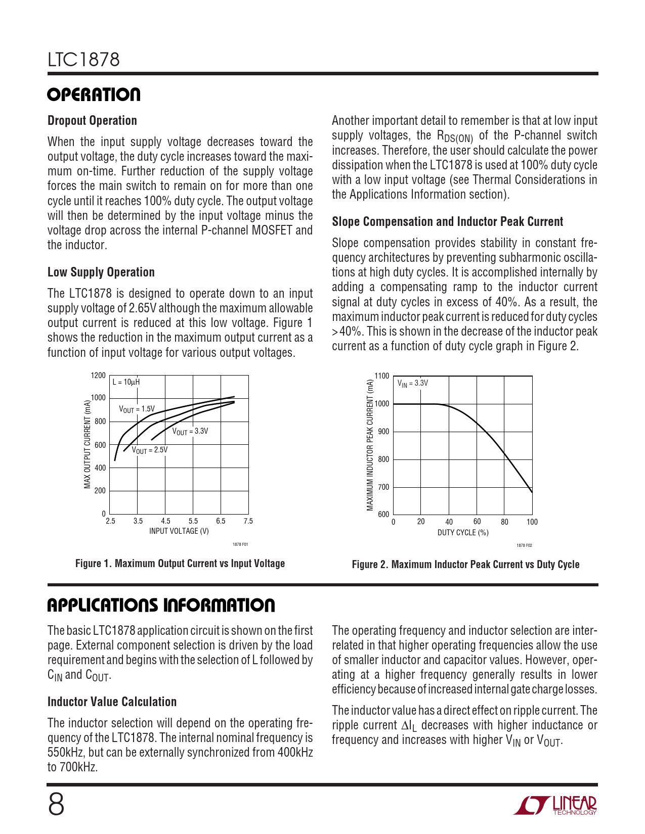 LTC1878 UOPERATIODropout Operation Another important detail to remember is that at low input supply voltages, the R When the input supply voltage decreases toward the DS(ON) of the P-channel switch increases. Therefore, the user should calculate the power output voltage, the duty cycle increases toward the maxi- dissipation when the LTC1878 is used at 100% duty cycle mum on-time. Further reduction of the supply voltage with a low input voltage (see Thermal Considerations in forces the main switch to remain on for more than one the Applications Information section). cycle until it reaches 100% duty cycle. The output voltage will then be determined by the input voltage minus the Slope Compensation and Inductor Peak Current voltage drop across the internal P-channel MOSFET and the inductor. Slope compensation provides stability in constant fre- quency architectures by preventing subharmonic oscilla- Low Supply Operation tions at high duty cycles. It is accomplished internally by adding a compensating ramp to the inductor current The LTC1878 is designed to operate down to an input signal at duty cycles in excess of 40%. As a result, the supply voltage of 2.65V although the maximum allowable maximum inductor peak current is reduced for duty cycles output current is reduced at this low voltage. Figure 1 > 40%. This is shown in the decrease of the inductor peak shows the reduction in the maximum output current as a current as a function of duty cycle graph in Figure 2. function of input voltage for various output voltages. 1200 1100 L = 10µH VIN = 3.3V 1000 1000 VOUT = 1.5V 800 VOUT = 3.3V 900 600 VOUT = 2.5V 800 400 MAX OUTPUT CURRENT (mA) 700 200 MAXIMUM INDUCTOR PEAK CURRENT (mA) 0 600 2.5 3.5 4.5 5.5 6.5 7.5 0 20 40 60 80 100 INPUT VOLTAGE (V) DUTY CYCLE (%) 1878 F01 1878 F02 Figure 1. Maximum Output Current vs Input VoltageFigure 2. Maximum Inductor Peak Current vs Duty CycleUUWUAPPLICATIO S I FOR ATIO The basic LTC1878 application circuit is shown on the first The operating frequency and inductor selection are inter- page. External component selection is driven by the load related in that higher operating frequencies allow the use requirement and begins with the selection of L followed by of smaller inductor and capacitor values. However, oper- CIN and COUT. ating at a higher frequency generally results in lower efficiency because of increased internal gate charge losses. Inductor Value Calculation The inductor value has a direct effect on ripple current. The The inductor selection will depend on the operating fre- ripple current ∆IL decreases with higher inductance or quency of the LTC1878. The internal nominal frequency is frequency and increases with higher VIN or VOUT. 550kHz, but can be externally synchronized from 400kHz to 700kHz. 8