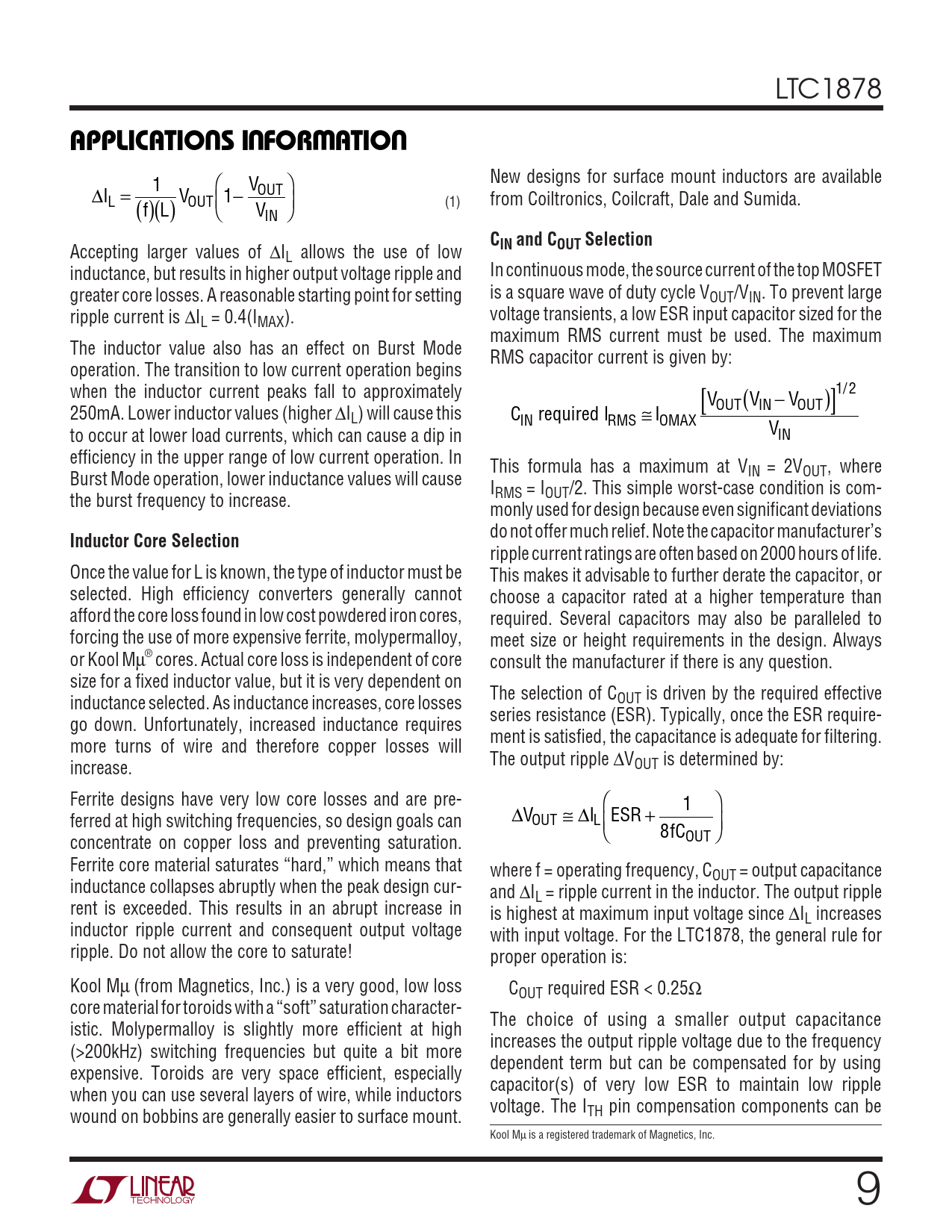ripple current ratings are often based on 2000 hours of life. Once the value for L is known, the type of inductor must be This makes it advisable to further derate the capacitor, or selected. High efficiency converters generally cannot choose a capacitor rated at a higher temperature than afford the core loss found in low cost powdered iron cores, required. Several capacitors may also be paralleled to forcing the use of more expensive ferrite, molypermalloy, meet size or height requirements in the design. Always or Kool Mµ® cores. Actual core loss is independent of core consult the manufacturer if there is any question. size for a fixed inductor value, but it is very dependent on The selection of C inductance selected. As inductance increases, core losses OUT is driven by the required effective series resistance (ESR). Typically, once the ESR require- go down. Unfortunately, increased inductance requires ment is satisfied, the capacitance is adequate for filtering. more turns of wire and therefore copper losses will The output ripple ∆V increase. OUT is determined by: Ferrite designs have very low core losses and are pre-  1  ferred at high switching frequencies, so design goals can ∆VOUT ≅ ∆I ESR L +  8fCOUT  concentrate on copper loss and preventing saturation. Ferrite core material saturates “hard,” which means that where f = operating frequency, COUT = output capacitance inductance collapses abruptly when the peak design cur- and ∆IL = ripple current in the inductor. The output ripple rent is exceeded. This results in an abrupt increase in is highest at maximum input voltage since ∆IL increases inductor ripple current and consequent output voltage with input voltage. For the LTC1878, the general rule for ripple. Do not allow the core to saturate! proper operation is: Kool Mµ (from Magnetics, Inc.) is a very good, low loss COUT required ESR < 0.25Ω core material for toroids with a “soft” saturation character- The choice of using a smaller output capacitance istic. Molypermalloy is slightly more efficient at high increases the output ripple voltage due to the frequency (>200kHz) switching frequencies but quite a bit more dependent term but can be compensated for by using expensive. Toroids are very space efficient, especially capacitor(s) of very low ESR to maintain low ripple when you can use several layers of wire, while inductors voltage. The I wound on bobbins are generally easier to surface mount. TH pin compensation components can be Kool Mµ is a registered trademark of Magnetics, Inc. 9