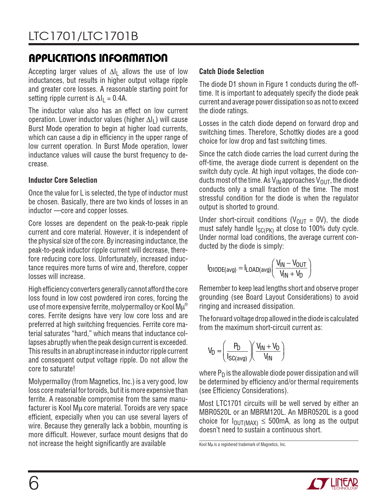 LTC1701/LTC1701B UUWUAPPLICATIO S I FOR ATIO Accepting larger values of ∆IL allows the use of low Catch Diode Selection inductances, but results in higher output voltage ripple The diode D1 shown in Figure 1 conducts during the off- and greater core losses. A reasonable starting point for time. It is important to adequately specify the diode peak setting ripple current is ∆IL = 0.4A. current and average power dissipation so as not to exceed The inductor value also has an effect on low current the diode ratings. operation. Lower inductor values (higher ∆IL) will cause Losses in the catch diode depend on forward drop and Burst Mode operation to begin at higher load currents, switching times. Therefore, Schottky diodes are a good which can cause a dip in efficiency in the upper range of choice for low drop and fast switching times. low current operation. In Burst Mode operation, lower inductance values will cause the burst frequency to de- Since the catch diode carries the load current during the crease. off-time, the average diode current is dependent on the switch duty cycle. At high input voltages, the diode con- Inductor Core Selection ducts most of the time. As VIN approaches VOUT, the diode conducts only a small fraction of the time. The most Once the value for L is selected, the type of inductor must stressful condition for the diode is when the regulator be chosen. Basically, there are two kinds of losses in an output is shorted to ground. inductor —core and copper losses. Under short-circuit conditions (V Core losses are dependent on the peak-to-peak ripple OUT = 0V), the diode must safely handle I current and core material. However, it is independent of SC(PK) at close to 100% duty cycle. Under normal load conditions, the average current con- the physical size of the core. By increasing inductance, the ducted by the diode is simply: peak-to-peak inductor ripple current will decrease, there- fore reducing core loss. Unfortunately, increased induc- V V tance requires more turns of wire and, therefore, copper I = − I IN OUT DIODE(avg) LOAD(avg) + losses will increase. V V IN D High efficiency converters generally cannot afford the core Remember to keep lead lengths short and observe proper loss found in low cost powdered iron cores, forcing the grounding (see Board Layout Considerations) to avoid use of more expensive ferrite, molypermalloy or Kool Mµ® ringing and increased dissipation. cores. Ferrite designs have very low core loss and are The forward voltage drop allowed in the diode is calculated preferred at high switching frequencies. Ferrite core ma- from the maximum short-circuit current as: terial saturates “hard,” which means that inductance col- lapses abruptly when the peak design current is exceeded. P V + V This results in an abrupt increase in inductor ripple current V D IN D D ≈ ( ) and consequent output voltage ripple. Do not allow the I V SC avg IN core to saturate! where PD is the allowable diode power dissipation and will Molypermalloy (from Magnetics, Inc.) is a very good, low be determined by efficiency and/or thermal requirements loss core material for toroids, but it is more expensive than (see Efficiency Considerations). ferrite. A reasonable compromise from the same manu- Most LTC1701 circuits will be well served by either an facturer is Kool Mµ core material. Toroids are very space MBR0520L or an MBRM120L. An MBR0520L is a good efficient, expecially when you can use several layers of choice for I wire. Because they generally lack a bobbin, mounting is OUT(MAX) ≤ 500mA, as long as the output doesn’t need to sustain a continuous short. more difficult. However, surface mount designs that do not increase the height significantly are available Kool Mµ is a registered trademark of Magnetics, Inc. 6