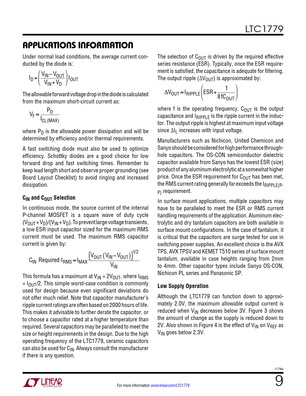 Pages / Page14 / 9 — applicaTions inForMaTion. CIN and COUT Selection. Low Supply Operation