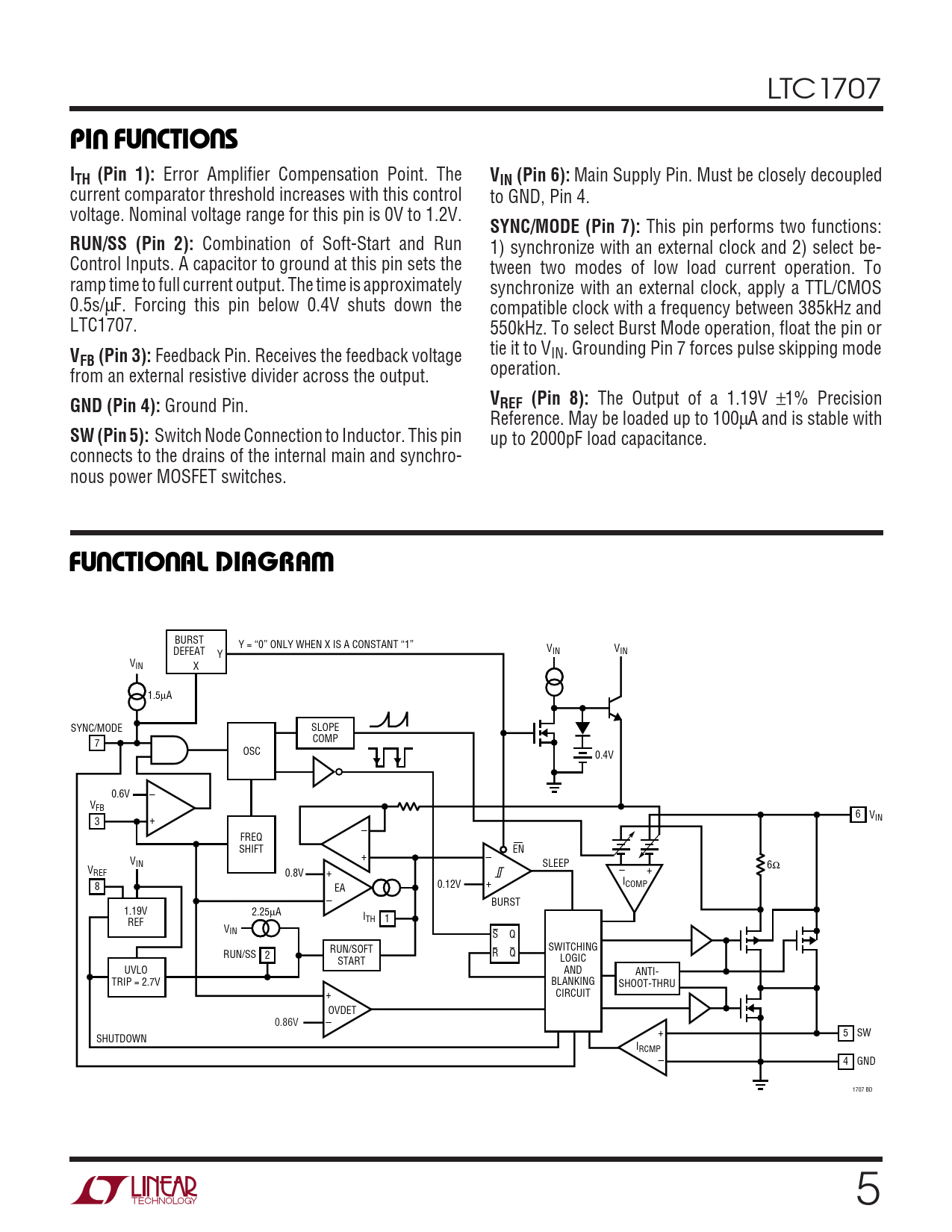 LTC1707 UUUPI FU CTIO S ITH (Pin 1): Error Amplifier Compensation Point. The VIN (Pin 6): Main Supply Pin. Must be closely decoupled current comparator threshold increases with this control to GND, Pin 4. voltage. Nominal voltage range for this pin is 0V to 1.2V. SYNC/MODE (Pin 7): This pin performs two functions: RUN/SS (Pin 2): Combination of Soft-Start and Run 1) synchronize with an external clock and 2) select be- Control Inputs. A capacitor to ground at this pin sets the tween two modes of low load current operation. To ramp time to full current output. The time is approximately synchronize with an external clock, apply a TTL/CMOS 0.5s/µF. Forcing this pin below 0.4V shuts down the compatible clock with a frequency between 385kHz and LTC1707. 550kHz. To select Burst Mode operation, float the pin or V tie it to VIN. Grounding Pin 7 forces pulse skipping mode FB (Pin 3): Feedback Pin. Receives the feedback voltage from an external resistive divider across the output. operation. GND (Pin 4): Ground Pin. VREF (Pin 8): The Output of a 1.19V ±1% Precision Reference. May be loaded up to 100µA and is stable with SW (Pin 5): Switch Node Connection to Inductor. This pin up to 2000pF load capacitance. connects to the drains of the internal main and synchro- nous power MOSFET switches. UUWFU CTIO AL DIAGRA BURST Y = “0” ONLY WHEN X IS A CONSTANT “1” V DEFEAT IN VIN Y VIN X 1.5µA SYNC/MODE SLOPE 7 COMP OSC 0.4V – 0.6V VFB + 6 V 3 IN – FREQ SHIFT EN + – VIN SLEEP 6Ω VREF 0.8V – + + + 0.12V I 8 EA COMP – BURST 1.19V 2.25µA ITH 1 REF VIN S Q SWITCHING RUN/SOFT RUN/SS 2 R Q LOGIC START UVLO AND ANTI- TRIP = 2.7V BLANKING SHOOT-THRU + CIRCUIT OVDET 0.86V – + 5 SW SHUTDOWN IRCMP – 4 GND 1707 BD 5