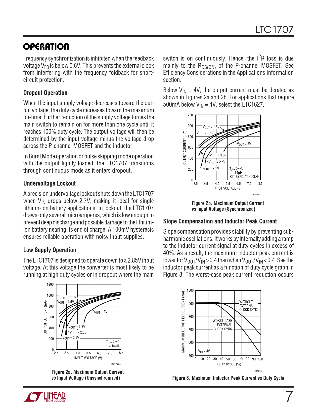 Below VIN = 4V, the output current must be derated as shown in Figures 2a and 2b. For applications that require When the input supply voltage decreases toward the out- 500mA below VIN = 4V, select the LTC1627. put voltage, the duty cycle increases toward the maximum on-time. Further reduction of the supply voltage forces the 1200 main switch to remain on for more than one cycle until it 1000 VOUT = 1.8V reaches 100% duty cycle. The output voltage will then be VOUT = 1.5V determined by the input voltage minus the voltage drop 800 across the P-channel MOSFET and the inductor. VOUT = 5V 600 In Burst Mode operation or pulse skipping mode operation VOUT = 3.3V 400 with the output lightly loaded, the LTC1707 transitions OUTPUT CURRENT (mA) VOUT = 2.5V through continuous mode as it enters dropout. 200 VOUT = 2.9V TJ = 25°C L = 15µH EXT SYNC AT 400kHz 0