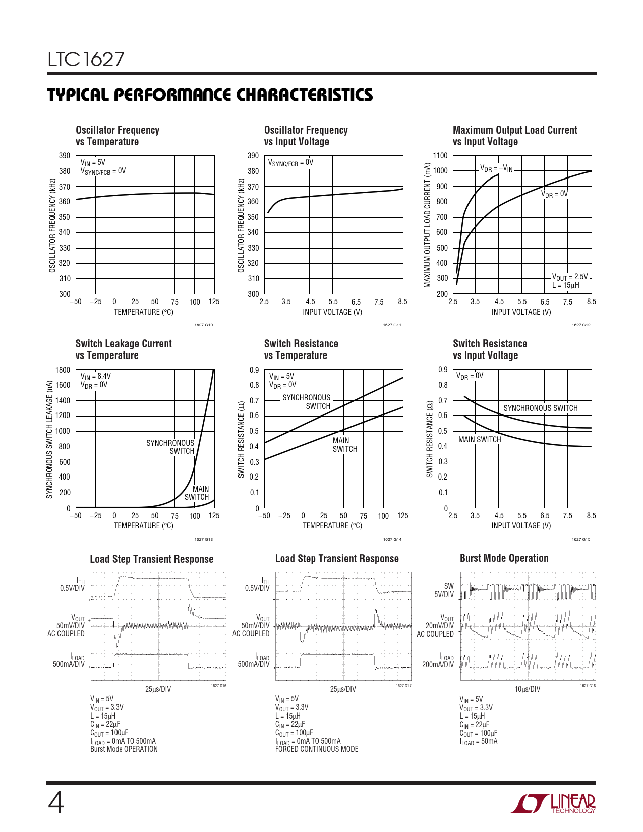 390 390 1100 VIN = 5V VSYNC/FCB = 0V V 380 V DR = –VIN SYNC/FCB = 0V 380 1000 370 370 900 VDR = 0V 360 360 800 350 350 700 340 340 600 330 330 500 320 320 400 OSCILLATOR FREQUENCY (kHz) OSCILLATOR FREQUENCY (kHz) 310 310 300 VOUT = 2.5V MAXIMUM OUTPUT LOAD CURRENT (mA) L = 15µH 300 300 200 – 50 – 25 0 25 50 75 100 125 2.5 3.5 4.5 5.5 6.5 7.5 8.5 2.5 3.5 4.5 5.5 6.5 7.5 8.5 TEMPERATURE (°C) INPUT VOLTAGE (V) INPUT VOLTAGE (V) 1627 G10 1627 G11 1627 G12