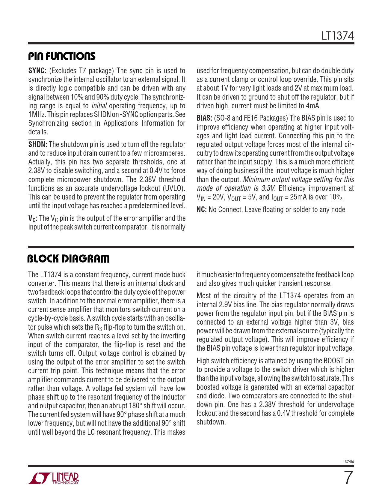 LT1374 UUUPI FU CTIO SSYNC: (Excludes T7 package) The sync pin is used to used for frequency compensation, but can do double duty synchronize the internal oscillator to an external signal. It as a current clamp or control loop override. This pin sits is directly logic compatible and can be driven with any at about 1V for very light loads and 2V at maximum load. signal between 10% and 90% duty cycle. The synchroniz- It can be driven to ground to shut off the regulator, but if ing range is equal to initial operating frequency, up to driven high, current must be limited to 4mA. 1MHz. This pin replaces SHDN on -SYNC option parts. See BIAS: (SO-8 and FE16 Packages) The BIAS pin is used to Synchronizing section in Applications Information for improve efficiency when operating at higher input volt- details. ages and light load current. Connecting this pin to the SHDN: The shutdown pin is used to turn off the regulator regulated output voltage forces most of the internal cir- and to reduce input drain current to a few microamperes. cuitry to draw its operating current from the output voltage Actually, this pin has two separate thresholds, one at rather than the input supply. This is a much more efficient 2.38V to disable switching, and a second at 0.4V to force way of doing business if the input voltage is much higher complete micropower shutdown. The 2.38V threshold than the output. Minimum output voltage setting for this functions as an accurate undervoltage lockout (UVLO). mode of operation is 3.3V. Efficiency improvement at This can be used to prevent the regulator from operating VIN = 20V, VOUT = 5V, and IOUT = 25mA is over 10%. until the input voltage has reached a predetermined level. NC: No Connect. Leave floating or solder to any node. VC: The VC pin is the output of the error amplifier and the input of the peak switch current comparator. It is normally WBLOCK DIAGRA The LT1374 is a constant frequency, current mode buck it much easier to frequency compensate the feedback loop converter. This means that there is an internal clock and and also gives much quicker transient response. two feedback loops that control the duty cycle of the power Most of the circuitry of the LT1374 operates from an switch. In addition to the normal error amplifier, there is a internal 2.9V bias line. The bias regulator normally draws current sense amplifier that monitors switch current on a power from the regulator input pin, but if the BIAS pin is cycle-by-cycle basis. A switch cycle starts with an oscilla- connected to an external voltage higher than 3V, bias tor pulse which sets the RS flip-flop to turn the switch on. power will be drawn from the external source (typically the When switch current reaches a level set by the inverting regulated output voltage). This will improve efficiency if input of the comparator, the flip-flop is reset and the the BIAS pin voltage is lower than regulator input voltage. switch turns off. Output voltage control is obtained by using the output of the error amplifier to set the switch High switch efficiency is attained by using the BOOST pin current trip point. This technique means that the error to provide a voltage to the switch driver which is higher amplifier commands current to be delivered to the output than the input voltage, allowing the switch to saturate. This rather than voltage. A voltage fed system will have low boosted voltage is generated with an external capacitor phase shift up to the resonant frequency of the inductor and diode. Two comparators are connected to the shut- and output capacitor, then an abrupt 180 down pin. One has a 2.38V threshold for undervoltage ° shift will occur. The current fed system will have 90 lockout and the second has a 0.4V threshold for complete ° phase shift at a much lower frequency, but will not have the additional 90 shutdown. ° shift until well beyond the LC resonant frequency. This makes 1374fd 7