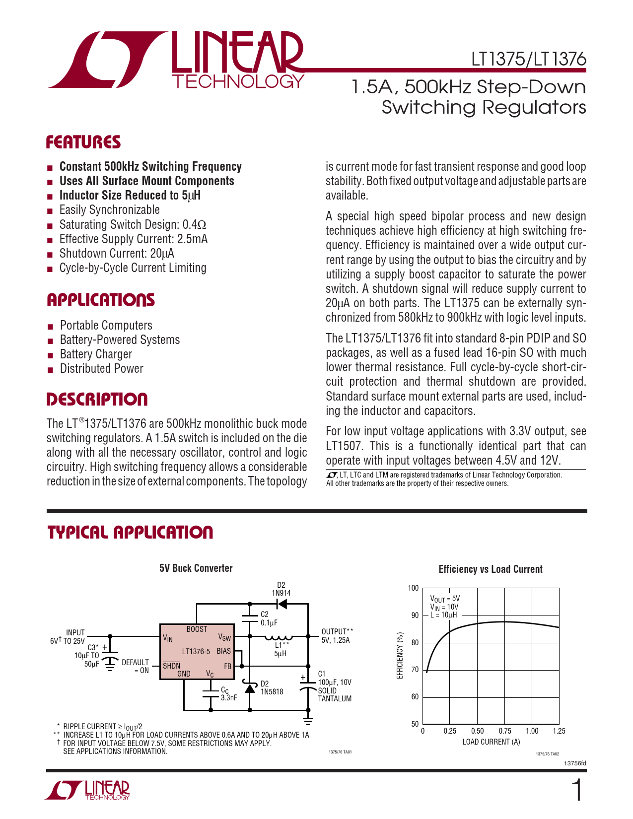 LT1375/LT1376 1.5A, 500kHz Step-Down Switching Regulators FEATURES ■ Constant 500kHz Switching Frequency is current mode for fast transient response and good loop ■ Uses All Surface Mount Components stability. Both fixed output voltage and adjustable parts are ■ Inductor Size Reduced to 5 µ H available. ■ Easily Synchronizable A special high speed bipolar process and new design ■ Saturating Switch Design: 0.4Ω techniques achieve high efficiency at high switching fre- ■ Effective Supply Current: 2.5mA quency. Efficiency is maintained over a wide output cur- ■ Shutdown Current: 20µA rent range by using the output to bias the circuitry and by ■ Cycle-by-Cycle Current Limiting utilizing a supply boost capacitor to saturate the power U switch. A shutdown signal will reduce supply current to APPLICATIO S 20µA on both parts. The LT1375 can be externally syn- chronized from 580kHz to 900kHz with logic level inputs. ■ Portable Computers ■ Battery-Powered Systems The LT1375/LT1376 fit into standard 8-pin PDIP and SO ■ Battery Charger packages, as well as a fused lead 16-pin SO with much ■ Distributed Power lower thermal resistance. Full cycle-by-cycle short-cir- U cuit protection and thermal shutdown are provided. DESCRIPTIO Standard surface mount external parts are used, includ- ing the inductor and capacitors. The LT®1375/LT1376 are 500kHz monolithic buck mode For low input voltage applications with 3.3V output, see switching regulators. A 1.5A switch is included on the die LT1507. This is a functionally identical part that can along with all the necessary oscillator, control and logic operate with input voltages between 4.5V and 12V. circuitry. High switching frequency allows a considerable , LT, LTC and LTM are registered trademarks of Linear Technology Corporation. reduction in the size of external components. The topology All other trademarks are the property of their respective owners. UTYPICAL APPLICATIO5V Buck ConverterEfficiency vs Load Current D2 100 1N914 VOUT = 5V VIN = 10V C2 90 L = 10µH 0.1µF BOOST INPUT OUTPUT** V V IN 6V† TO 25V SW 5V, 1.25A 80 C3* L1** + LT1376-5 BIAS 10µF TO 5µH 50µF DEFAULT SHDN FB = ON 70 GND VC C1 + EFFICIENCY (%) D2 100µF, 10V CC 1N5818 SOLID 3.3nF 60 TANTALUM 50 * RIPPLE CURRENT ≥ IOUT/2 0 0.25 0.50 0.75 1.00 1.25 ** INCREASE L1 TO 10µH FOR LOAD CURRENTS ABOVE 0.6A AND TO 20µH ABOVE 1A † LOAD CURRENT (A) FOR INPUT VOLTAGE BELOW 7.5V, SOME RESTRICTIONS MAY APPLY. SEE APPLICATIONS INFORMATION. 1375/76 TA01 1375/76 TA02 13756fd 1