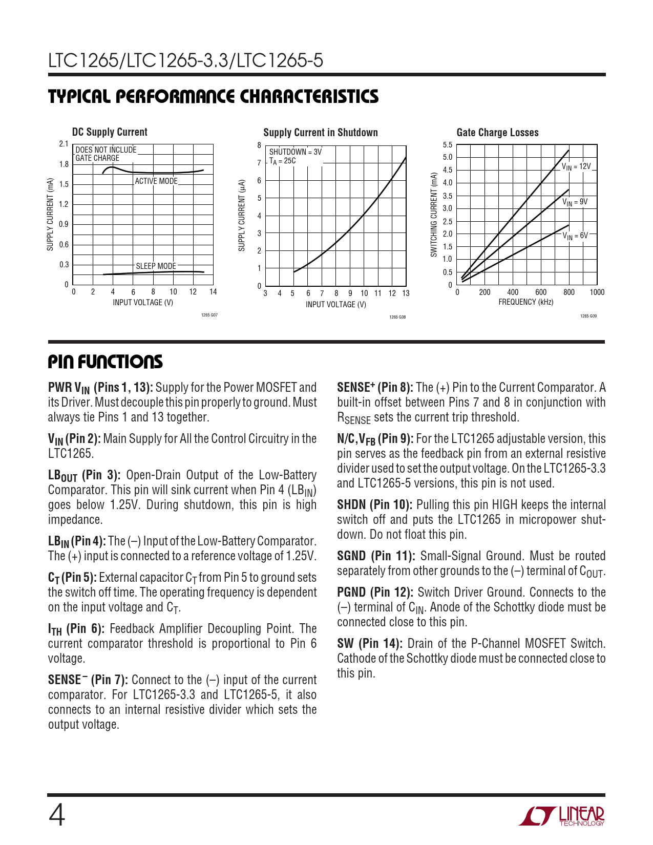 LTC1265/LTC1265-3.3/LTC1265-5 WUTYPICAL PERFOR A CE CHARACTERISTICSDC Supply CurrentSupply Current in ShutdownGate Charge Losses 2.1 8 5.5 DOES NOT INCLUDE SHUTDOWN = 3V GATE CHARGE 5.0 T 1.8 7 A = 25C V 4.5 IN = 12V 1.5 ACTIVE MODE µA) 6 4.0 5 3.5 1.2 VIN = 9V 3.0 4 0.9 2.5 3 2.0 VIN = 6V 0.6 SUPPLY CURRENT (mA) SUPPLY CURRENT ( 1.5 2 SWITCHING CURRENT (mA) 1.0 0.3 SLEEP MODE 1 0.5 0 0 0 0 2 4 6 8 10 12 14 3 4 5 6 7 8 9 10 11 12 13 0 200 400 600 800 1000 INPUT VOLTAGE (V) INPUT VOLTAGE (V) FREQUENCY (kHz) 1265 G07 1265 G08 1265 G09 UUUPI FU CTIO SPWR VIN (Pins 1, 13): Supply for the Power MOSFET and SENSE+ (Pin 8): The (+) Pin to the Current Comparator. A its Driver. Must decouple this pin properly to ground. Must built-in offset between Pins 7 and 8 in conjunction with always tie Pins 1 and 13 together. RSENSE sets the current trip threshold. VIN (Pin 2): Main Supply for All the Control Circuitry in the N/C,VFB (Pin 9): For the LTC1265 adjustable version, this LTC1265. pin serves as the feedback pin from an external resistive divider used to set the output voltage. On the LTC1265-3.3 LBOUT (Pin 3): Open-Drain Output of the Low-Battery and LTC1265-5 versions, this pin is not used. Comparator. This pin will sink current when Pin 4 (LBIN) goes below 1.25V. During shutdown, this pin is high SHDN (Pin 10): Pulling this pin HIGH keeps the internal impedance. switch off and puts the LTC1265 in micropower shut- down. Do not float this pin. LBIN (Pin 4): The (–) Input of the Low-Battery Comparator. The (+) input is connected to a reference voltage of 1.25V. SGND (Pin 11): Small-Signal Ground. Must be routed separately from other grounds to the (–) terminal of C C OUT. T (Pin 5): External capacitor CT from Pin 5 to ground sets the switch off time. The operating frequency is dependent PGND (Pin 12): Switch Driver Ground. Connects to the on the input voltage and CT. (–) terminal of CIN. Anode of the Schottky diode must be connected close to this pin. ITH (Pin 6): Feedback Amplifier Decoupling Point. The current comparator threshold is proportional to Pin 6 SW (Pin 14): Drain of the P-Channel MOSFET Switch. voltage. Cathode of the Schottky diode must be connected close to this pin. SENSE – (Pin 7): Connect to the (–) input of the current comparator. For LTC1265-3.3 and LTC1265-5, it also connects to an internal resistive divider which sets the output voltage. 4