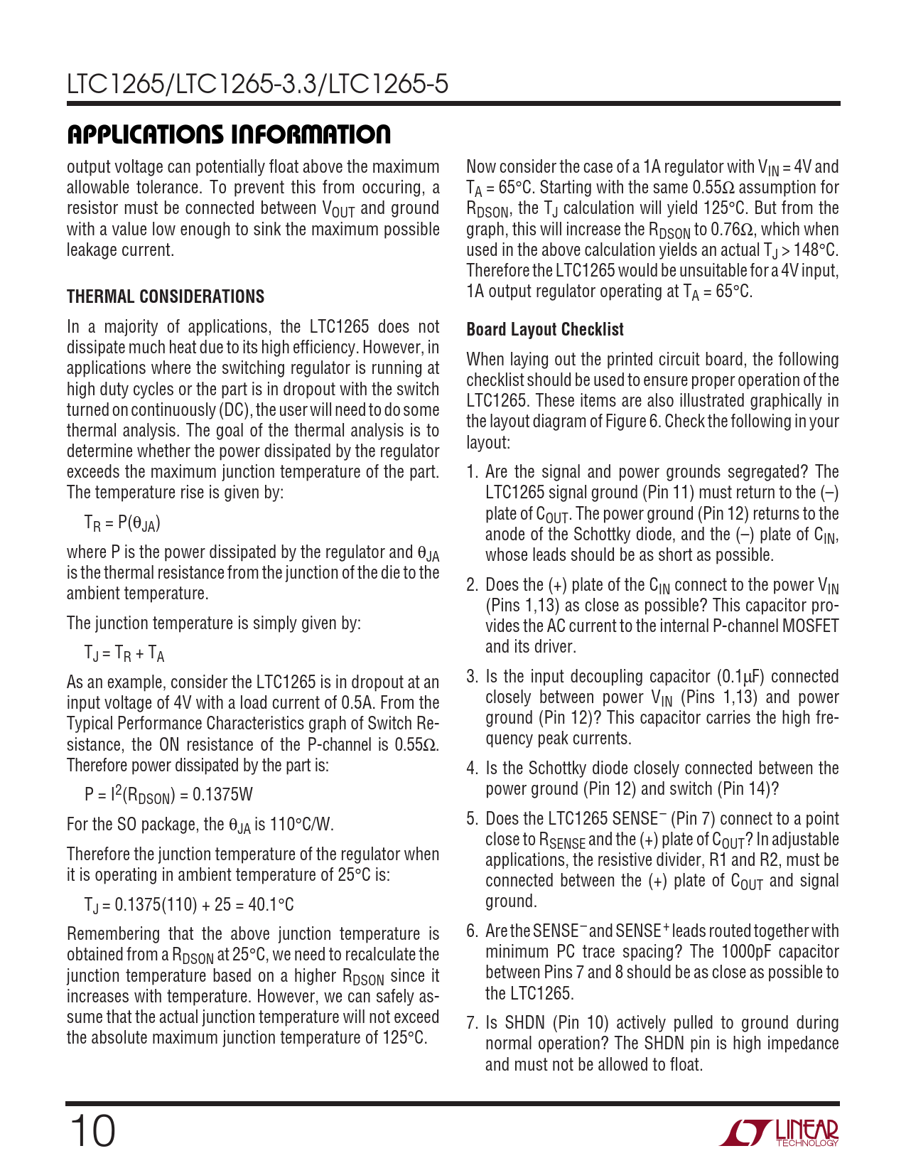 LTC1265/LTC1265-3.3/LTC1265-5 UUWUAPPLICATIONS INFORMATION output voltage can potentially float above the maximum Now consider the case of a 1A regulator with VIN = 4V and allowable tolerance. To prevent this from occuring, a TA = 65°C. Starting with the same 0.55Ω assumption for resistor must be connected between VOUT and ground RDSON, the TJ calculation will yield 125°C. But from the with a value low enough to sink the maximum possible graph, this will increase the RDSON to 0.76Ω, which when leakage current. used in the above calculation yields an actual TJ > 148°C. Therefore the LTC1265 would be unsuitable for a 4V input, THERMAL CONSIDERATIONS 1A output regulator operating at TA = 65°C. In a majority of applications, the LTC1265 does not Board Layout Checklist dissipate much heat due to its high efficiency. However, in When laying out the printed circuit board, the following applications where the switching regulator is running at checklist should be used to ensure proper operation of the high duty cycles or the part is in dropout with the switch LTC1265. These items are also illustrated graphically in turned on continuously (DC), the user will need to do some the layout diagram of Figure 6. Check the following in your thermal analysis. The goal of the thermal analysis is to layout: determine whether the power dissipated by the regulator exceeds the maximum junction temperature of the part. 1. Are the signal and power grounds segregated? The The temperature rise is given by: LTC1265 signal ground (Pin 11) must return to the (–) plate of C T OUT. The power ground (Pin 12) returns to the R = P(θJA) anode of the Schottky diode, and the (–) plate of CIN, where P is the power dissipated by the regulator and θJA whose leads should be as short as possible. is the thermal resistance from the junction of the die to the 2. Does the (+) plate of the C ambient temperature. IN connect to the power VIN (Pins 1,13) as close as possible? This capacitor pro- The junction temperature is simply given by: vides the AC current to the internal P-channel MOSFET T and its driver. J = TR + TA As an example, consider the LTC1265 is in dropout at an 3. Is the input decoupling capacitor (0.1µF) connected input voltage of 4V with a load current of 0.5A. From the closely between power VIN (Pins 1,13) and power Typical Performance Characteristics graph of Switch Re- ground (Pin 12)? This capacitor carries the high fre- sistance, the ON resistance of the P-channel is 0.55Ω. quency peak currents. Therefore power dissipated by the part is: 4. Is the Schottky diode closely connected between the P = I2(R power ground (Pin 12) and switch (Pin 14)? DSON) = 0.1375W For the SO package, the θ 5. Does the LTC1265 SENSE– (Pin 7) connect to a point JA is 110°C/W. close to RSENSE and the (+) plate of COUT? In adjustable Therefore the junction temperature of the regulator when applications, the resistive divider, R1 and R2, must be it is operating in ambient temperature of 25°C is: connected between the (+) plate of COUT and signal T ground. J = 0.1375(110) + 25 = 40.1°C Remembering that the above junction temperature is 6. Are the SENSE– and SENSE+ leads routed together with obtained from a R minimum PC trace spacing? The 1000pF capacitor DSON at 25°C, we need to recalculate the junction temperature based on a higher R between Pins 7 and 8 should be as close as possible to DSON since it increases with temperature. However, we can safely as- the LTC1265. sume that the actual junction temperature will not exceed 7. Is SHDN (Pin 10) actively pulled to ground during the absolute maximum junction temperature of 125°C. normal operation? The SHDN pin is high impedance and must not be allowed to float. 10
