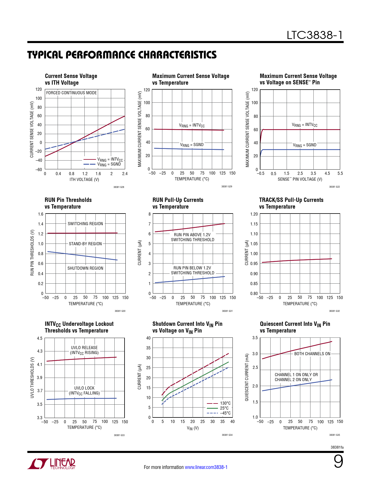 120 120 120 FORCED CONTINUOUS MODE 100 100 100 80 60 80 80 40 VRNG = INTVCC VRNG = INTVCC 60 60 20 0 40 V 40 RNG = SGND VRNG = SGND –20 CURRENT SENSE VOLTAGE (mV) 20 20 –40 VRNG = INTVCC VRNG = SGND MAXIMUM CURRENT SENSE VOLTAGE (mV) –60 0 MAXIMUM CURRENT SENSE VOLTAGE (mV) 0 0 0.4 0.8 1.2 1.6 2 2.4 –50 –25 0 25 50 75 100 125 150 –0.5 0.5 1.5 2.5 3.5 4.5 5.5 ITH VOLTAGE (V) TEMPERATURE (°C) SENSE– PIN VOLTAGE (V) 38381 G28 38381 G29 38381 G22