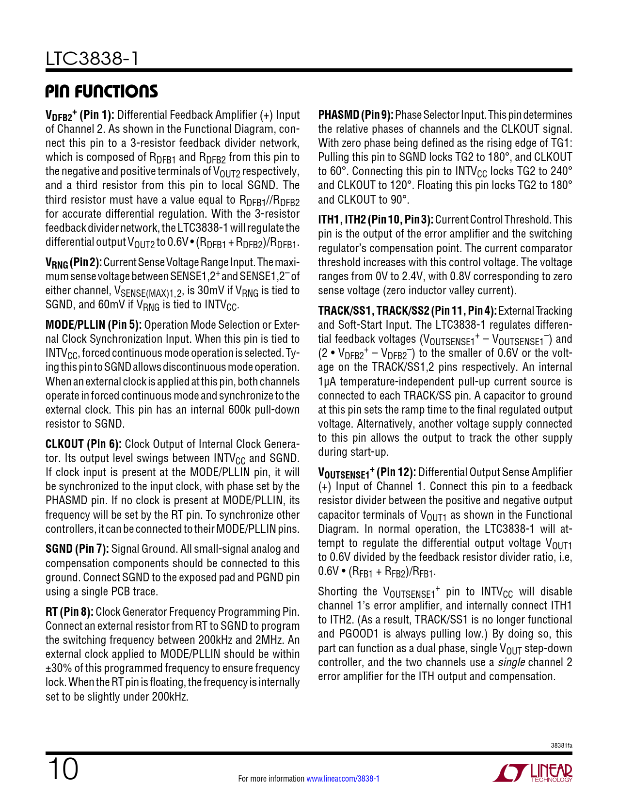 pin FuncTions. DFB2 (Pin 1):. PHASMD (Pin 9):. ITH1, ITH2 (Pin 10, Pin 3):. VRNG (Pin 2):. TRACK/SS1, TRACK/SS2 (Pin 11, Pin 4):