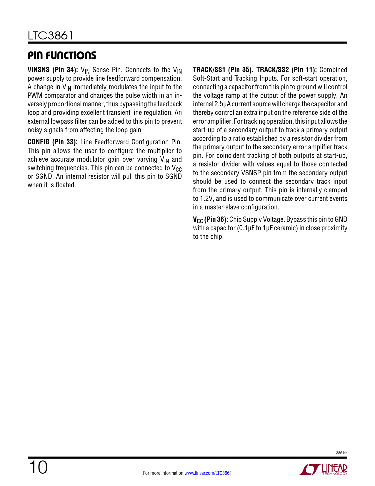 pin FuncTions VINSNS (Pin 34):. TRACK/SS1 (Pin 35), TRACK/SS2 (Pin 11):. CONFIG (Pin 33):. VCC (Pin 36):