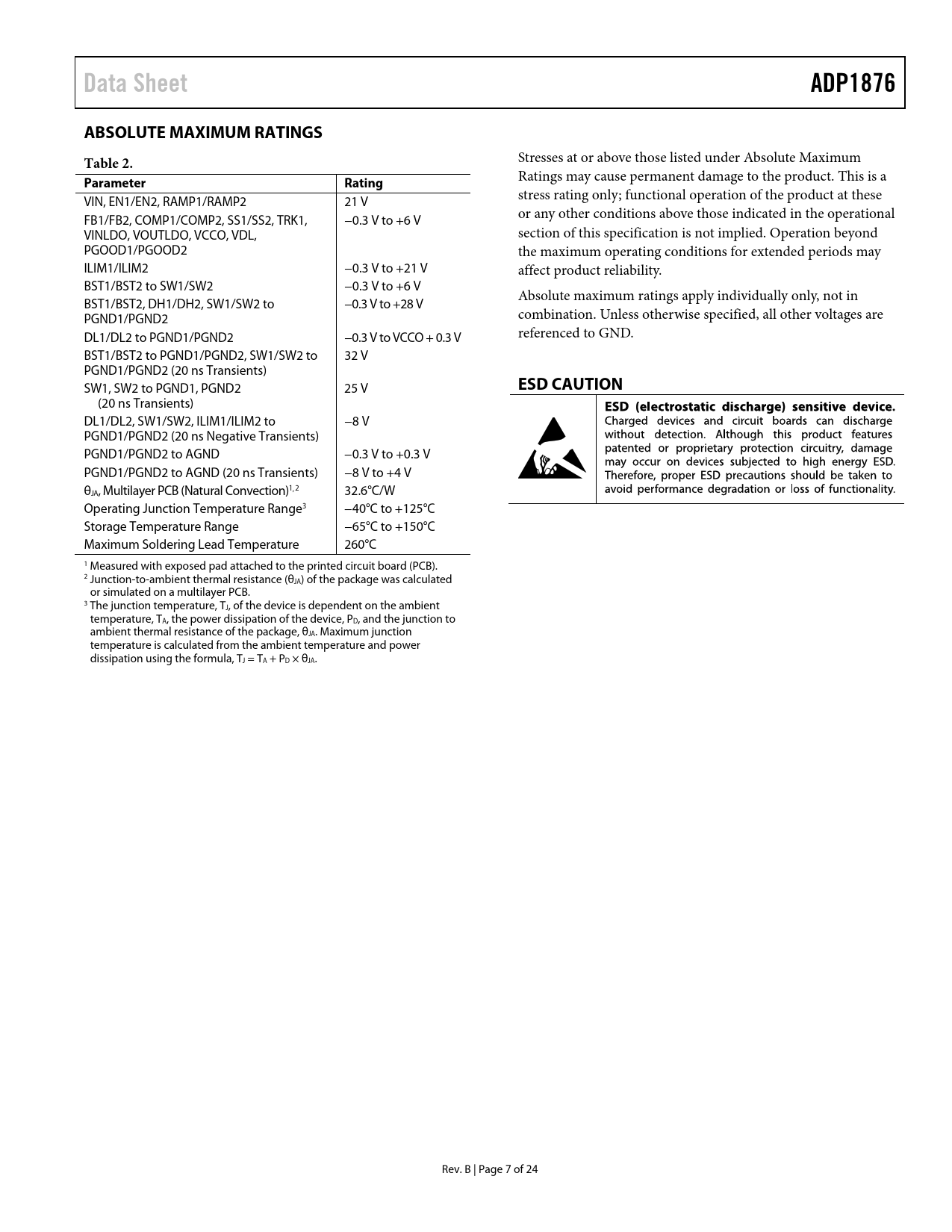 Pages / Page24 / 7 — Data Sheet. ADP1876. ABSOLUTE MAXIMUM RATINGS. Table 2. Parameter. …