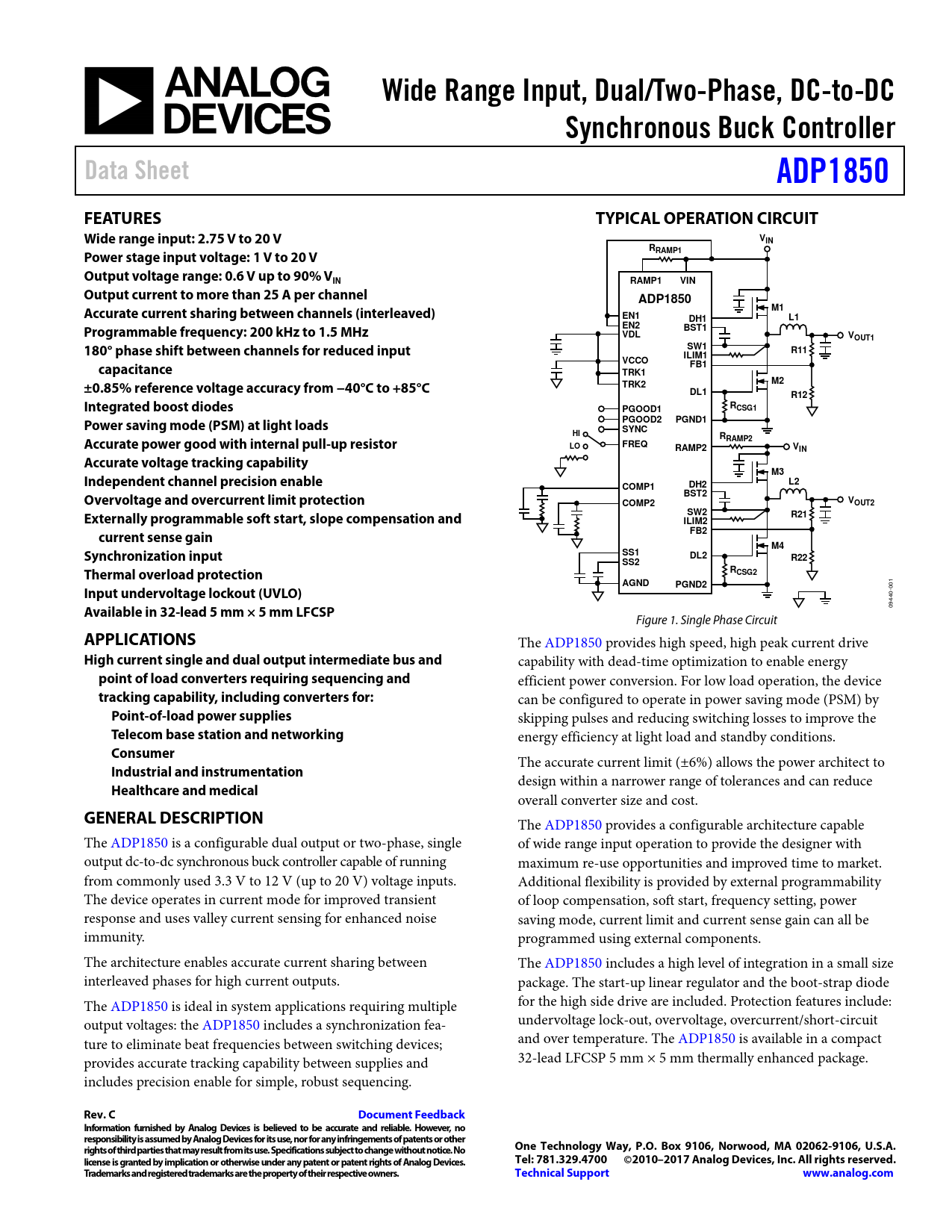 Wide Range Input, Dual/Two-Phase, DC-to-DC. Synchronous Buck Controller. Data Sheet. ADP1850. FEATURES. TYPICAL OPERATION CIRCUIT