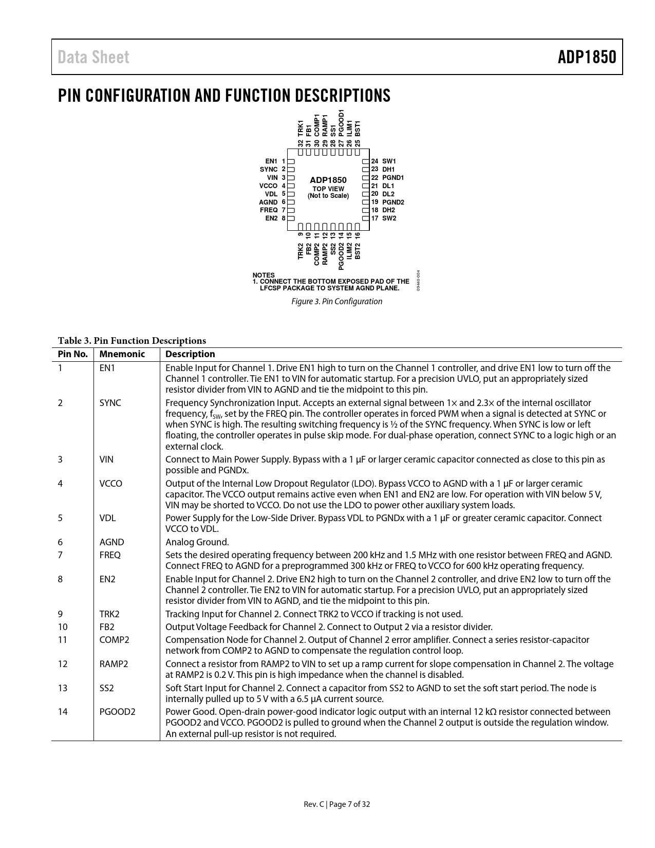 Data SheetADP1850PIN CONFIGURATION AND FUNCTION DESCRIPTIONS11 P11MP1TRK1B1OGOODTFCRAMSS1PILIMBS3231302928272625EN1 124 SW1SYNC 223 DH1VIN 322 PGND1ADP1850VCCO 421 DL1TOP VIEWVDL 520 DL2(Not to Scale)AGND 619 PGND2FREQ 718 DH2EN2 817 SW29110112131415162222B2PTRK2FMP2SS2TOILIMBSCRAMGOOD PNOTES 004 1. CONNECT THE BOTTOM EXPOSED PAD OF THELFCSP PACKAGE TO SYSTEM AGND PLANE. 09440- Figure 3. Pin Configuration Table 3. Pin Function Descriptions Pin No. MnemonicDescription 1 EN1 Enable Input for Channel 1. Drive EN1 high to turn on the Channel 1 controller, and drive EN1 low to turn off the Channel 1 controller. Tie EN1 to VIN for automatic startup. For a precision UVLO, put an appropriately sized resistor divider from VIN to AGND and tie the midpoint to this pin. 2 SYNC Frequency Synchronization Input. Accepts an external signal between 1× and 2.3× of the internal oscillator frequency, f , set by the FREQ pin. The controller operates in forced PWM when a signal is detected at SYNC or SW when SYNC is high. The resulting switching frequency is ½ of the SYNC frequency. When SYNC is low or left floating, the controller operates in pulse skip mode. For dual-phase operation, connect SYNC to a logic high or an external clock. 3 VIN Connect to Main Power Supply. Bypass with a 1 µF or larger ceramic capacitor connected as close to this pin as possible and PGNDx. 4 VCCO Output of the Internal Low Dropout Regulator (LDO). Bypass VCCO to AGND with a 1 μF or larger ceramic capacitor. The VCCO output remains active even when EN1 and EN2 are low. For operation with VIN below 5 V, VIN may be shorted to VCCO. Do not use the LDO to power other auxiliary system loads. 5 VDL Power Supply for the Low-Side Driver. Bypass VDL to PGNDx with a 1 µF or greater ceramic capacitor. Connect VCCO to VDL. 6 AGND Analog Ground. 7 FREQ Sets the desired operating frequency between 200 kHz and 1.5 MHz with one resistor between FREQ and AGND. Connect FREQ to AGND for a preprogrammed 300 kHz or FREQ to VCCO for 600 kHz operating frequency. 8 EN2 Enable Input for Channel 2. Drive EN2 high to turn on the Channel 2 controller, and drive EN2 low to turn off the Channel 2 controller. Tie EN2 to VIN for automatic startup. For a precision UVLO, put an appropriately sized resistor divider from VIN to AGND, and tie the midpoint to this pin. 9 TRK2 Tracking Input for Channel 2. Connect TRK2 to VCCO if tracking is not used. 10 FB2 Output Voltage Feedback for Channel 2. Connect to Output 2 via a resistor divider. 11 COMP2 Compensation Node for Channel 2. Output of Channel 2 error amplifier. Connect a series resistor-capacitor network from COMP2 to AGND to compensate the regulation control loop. 12 RAMP2 Connect a resistor from RAMP2 to VIN to set up a ramp current for slope compensation in Channel 2. The voltage at RAMP2 is 0.2 V. This pin is high impedance when the channel is disabled. 13 SS2 Soft Start Input for Channel 2. Connect a capacitor from SS2 to AGND to set the soft start period. The node is internally pulled up to 5 V with a 6.5 µA current source. 14 PGOOD2 Power Good. Open-drain power-good indicator logic output with an internal 12 kΩ resistor connected between PGOOD2 and VCCO. PGOOD2 is pulled to ground when the Channel 2 output is outside the regulation window. An external pull-up resistor is not required. Rev. C | Page 7 of 32 Document Outline Features Applications General Description Typical Operation Circuit Revision History Specifications Absolute Maximum Ratings ESD Caution Simplified Block Diagram Pin Configuration and Function Descriptions Typical Performance Characteristics Theory of Operation Control Architecture Oscillator Frequency Modes of Operation Synchronization Synchronous Rectifier and Dead Time Input Undervoltage Lockout Internal Linear Regulator Overvoltage Protection Power Good Short-Circuit and Current-Limit Protection Shutdown Control Thermal Overload Protection Applications Information Setting the Output Voltage Soft Start Setting the Current Limit Accurate Current-Limit Sensing Setting the Slope Compensation Setting the Current Sense Gain Input Capacitor Selection Input Filter Boost Capacitor Selection Inductor Selection Output Capacitor Selection MOSFET Selection Loop Compensation (Single Phase Operation) Configuration and Loop Compensation (Dual-Phase Operation) Switching Noise and Overshoot Reduction Voltage Tracking Coincident Tracking Ratiometric Tracking Indepdendent Power Stage Input Voltage PCB Layout Guidelines MOSFETs, Input Bulk Capacitor, and Bypass Capacitor High Current and Current Sense Paths Signal Paths PGND Plane Feedback and Current-Limit Sense Paths Switch Node Gate Driver Paths Output Capacitors Typical Operating Circuits Outline Dimensions Ordering Guide
