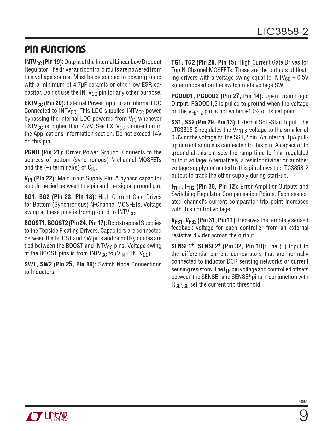 Pages / Page40 / 9 — PIN FUNCTIONS. INTVCC (Pin 19):. TG1, TG2 (Pin 26, Pin 15):. PGOOD1, …