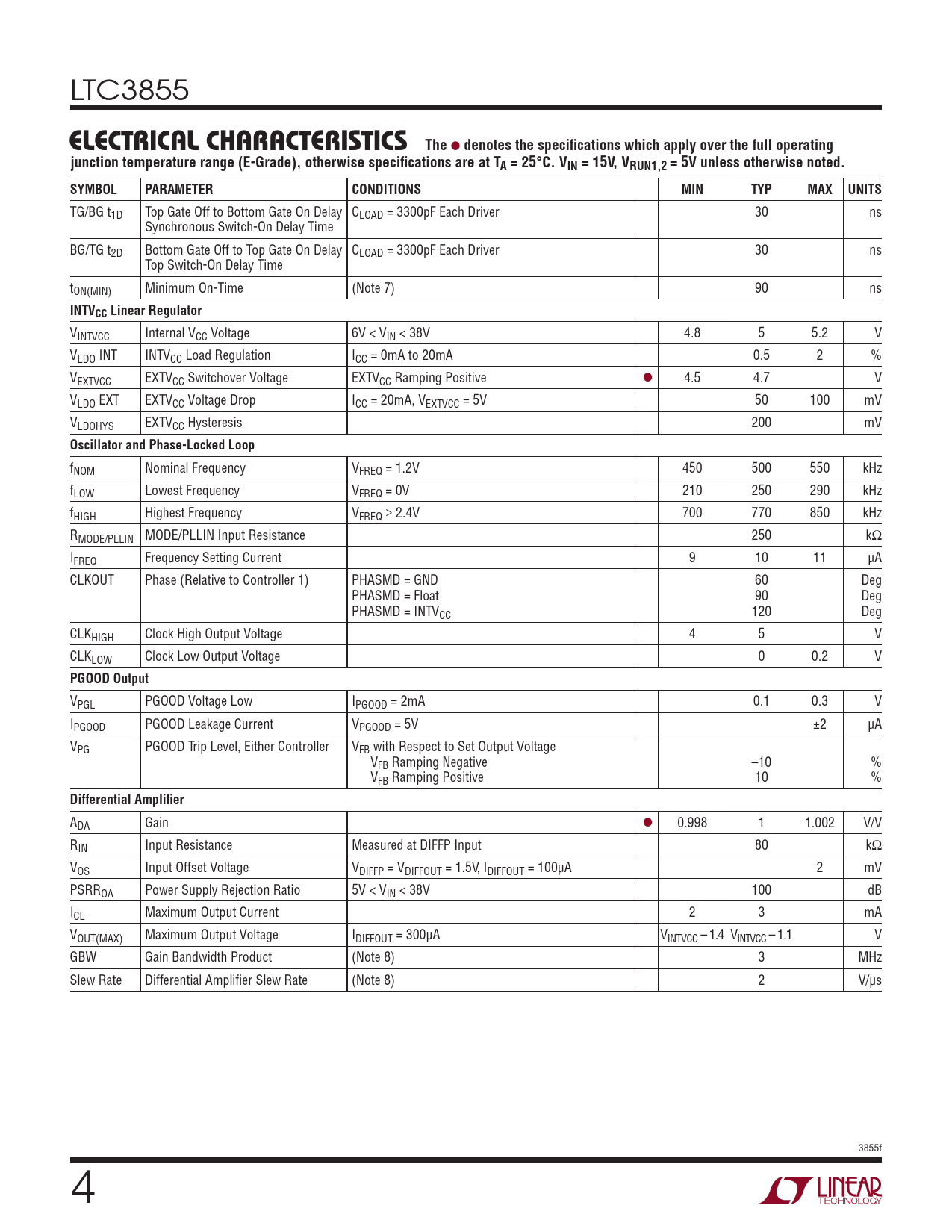 denotes the specifications which apply over the full operating junction temperature range (E-Grade), otherwise specifications are at TA = 25°C. VIN = 15V, VRUN1,2 = 5V unless otherwise noted. SYMBOL PARAMETER CONDITIONS MIN TYP MAX UNITS