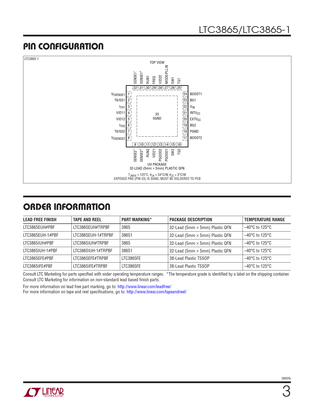 LTC3865/LTC3865-1 PIN CONFIGURATION LTC3865-1 TOP VIEW – + SENSE1 SENSE1 RUN1 FREQ VID22 MODE/PLLIN SW1 TG1 32 31 30 29 28 27 26 25 V 1 24 OSENSE1 BOOST1 TK/SS1 2 23 BG1 ITH1 3 22 VIN VID11 4 33 21 INTVCC VID12 5 SGND 20 EXTVCC ITH2 6 19 BG2 TK/SS2 7 18 PGND V 8 17 OSENSE2 BOOST2 9 10 11 12 13 14 15 16 – + RUN2 SW2 TG2 VID21 SENSE2 SENSE2 PGOOD2 PGOOD1 UH PACKAGE 32-LEAD (5mm s 5mm) PLASTIC QFN TJMAX = 125°C, θJA = 34°C/W, θJC = 3°C/W EXPOSED PAD (PIN 33) IS SGND, MUST BE SOLDERED TO PCB ORDER INFORMATIONLEAD FREE FINISHTAPE AND REELPART MARKING*PACKAGE DESCRIPTIONTEMPERATURE RANGE LTC3865EUH#PBF LTC3865EUH#TRPBF 3865 32-Lead (5mm × 5mm) Plastic QFN –40°C to 125°C LTC3865EUH-1#PBF LTC3865EUH-1#TRPBF 38651 32-Lead (5mm × 5mm) Plastic QFN –40°C to 125°C LTC3865IUH#PBF LTC3865IUH#TRPBF 3865 32-Lead (5mm × 5mm) Plastic QFN –40°C to 125°C LTC3865IUH-1#PBF LTC3865IUH-1#TRPBF 38651 32-Lead (5mm × 5mm) Plastic QFN –40°C to 125°C LTC3865EFE#PBF LTC3865EFE#TRPBF LTC3865FE 38-Lead Plastic TSSOP –40°C to 125°C LTC3865IFE#PBF LTC3865IFE#TRPBF LTC3865FE 38-Lead Plastic TSSOP –40°C to 125°C Consult LTC Marketing for parts specifi ed with wider operating temperature ranges. *The temperature grade is identifi ed by a label on the shipping container. Consult LTC Marketing for information on non-standard lead based fi nish parts. For more information on lead free part marking, go to: http://www.linear.com/leadfree/ For more information on tape and reel specifi cations, go to: http://www.linear.com/tapeandreel/ 3865fb 3
