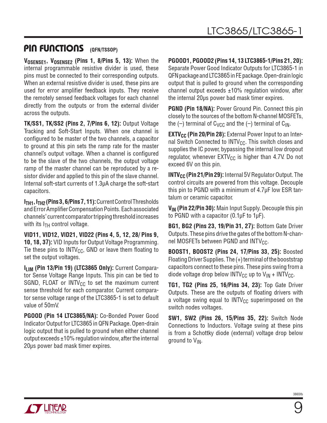LTC3865/LTC3865-1 PIN FUNCTIONS (QFN/TSSOP)VOSENSE1, VOSENSE2 (Pins 1, 8/Pins 5, 13): When the PGOOD1, PGOOD2 (Pins 14, 13 LTC3865-1/Pins 21, 20): internal programmable resistive divider is used, these Separate Power Good Indicator Outputs for LTC3865-1 in pins must be connected to their corresponding outputs. QFN package and LTC3865 in FE package. Open-drain logic When an external resistive divider is used, these pins are output that is pulled to ground when the corresponding used for error amplifi er feedback inputs. They receive channel output exceeds ±10% regulation window, after the remotely sensed feedback voltages for each channel the internal 20μs power bad mask timer expires. directly from the outputs or from the external divider PGND (Pin 18/NA): Power Ground Pin. Connect this pin across the outputs. closely to the sources of the bottom N-channel MOSFETs, TK/SS1, TK/SS2 (Pins 2, 7/Pins 6, 12): Output Voltage the (–) terminal of CVCC and the (–) terminal of CIN. Tracking and Soft-Start Inputs. When one channel is EXTV confi gured to be master of the two channels, a capacitor CC (Pin 20/Pin 28): External Power Input to an Inter- nal Switch Connected to INTV to ground at this pin sets the ramp rate for the master CC. This switch closes and supplies the IC power, bypassing the internal low dropout channel’s output voltage. When a channel is confi gured regulator, whenever EXTV to be the slave of the two channels, the output voltage CC is higher than 4.7V. Do not exceed 6V on this pin. ramp of the master channel can be reproduced by a re- sistor divider and applied to this pin of the slave channel. INTVCC (Pin 21/Pin 29): Internal 5V Regulator Output. The Internal soft-start currents of 1.3μA charge the soft-start control circuits are powered from this voltage. Decouple capacitors. this pin to PGND with a minimum of 4.7μF low ESR tan- talum or ceramic capacitor. ITH1, ITH2 (Pins 3, 6/Pins 7, 11): Current Control Thresholds and Error Amplifi er Compensation Points. Each associated VIN (Pin 22/Pin 30): Main Input Supply. Decouple this pin channels’ current comparator tripping threshold increases to PGND with a capacitor (0.1μF to 1μF). with its ITH control voltage. BG1, BG2 (Pins 23, 19/Pin 31, 27): Bottom Gate Driver VID11, VID12, VID21, VID22 (Pins 4, 5, 12, 28/ Pins 9, Outputs. These pins drive the gates of the bottom N-chan- 10, 18, 37): VID Inputs for Output Voltage Programming. nel MOSFETs between PGND and INTVCC. Tie these pins to INTVCC, GND or leave them fl oating to BOOST1, BOOST2 (Pins 24, 17/Pins 33, 25): Boosted set the output voltages. Floating Driver Supplies. The (+) terminal of the booststrap I capacitors connect to these pins. These pins swing from a LIM (Pin 13/Pin 19) (LTC3865 Only): Current Compara- tor Sense Voltage Range Inputs. This pin can be tied to diode voltage drop below INTVCC up to VIN + INTVCC. SGND, FLOAT or INTVCC to set the maximum current TG1, TG2 (Pins 25, 16/Pins 34, 23): Top Gate Driver sense threshold for each comparator. Current compara- Outputs. These are the outputs of fl oating drivers with tor sense voltage range of the LTC3865-1 is set to default a voltage swing equal to INTVCC superimposed on the value of 50mV. switch nodes voltages. PGOOD (Pin 14 LTC3865/NA): Co-Bonded Power Good SW1, SW2 (Pins 26, 15/Pins 35, 22): Switch Node Indicator Output for LTC3865 in QFN Package. Open-drain Connections to Inductors. Voltage swing at these pins logic output that is pulled to ground when either channel is from a Schottky diode (external) voltage drop below output exceeds ±10% regulation window, after the internal ground to VIN. 20μs power bad mask timer expires. 3865fb 9