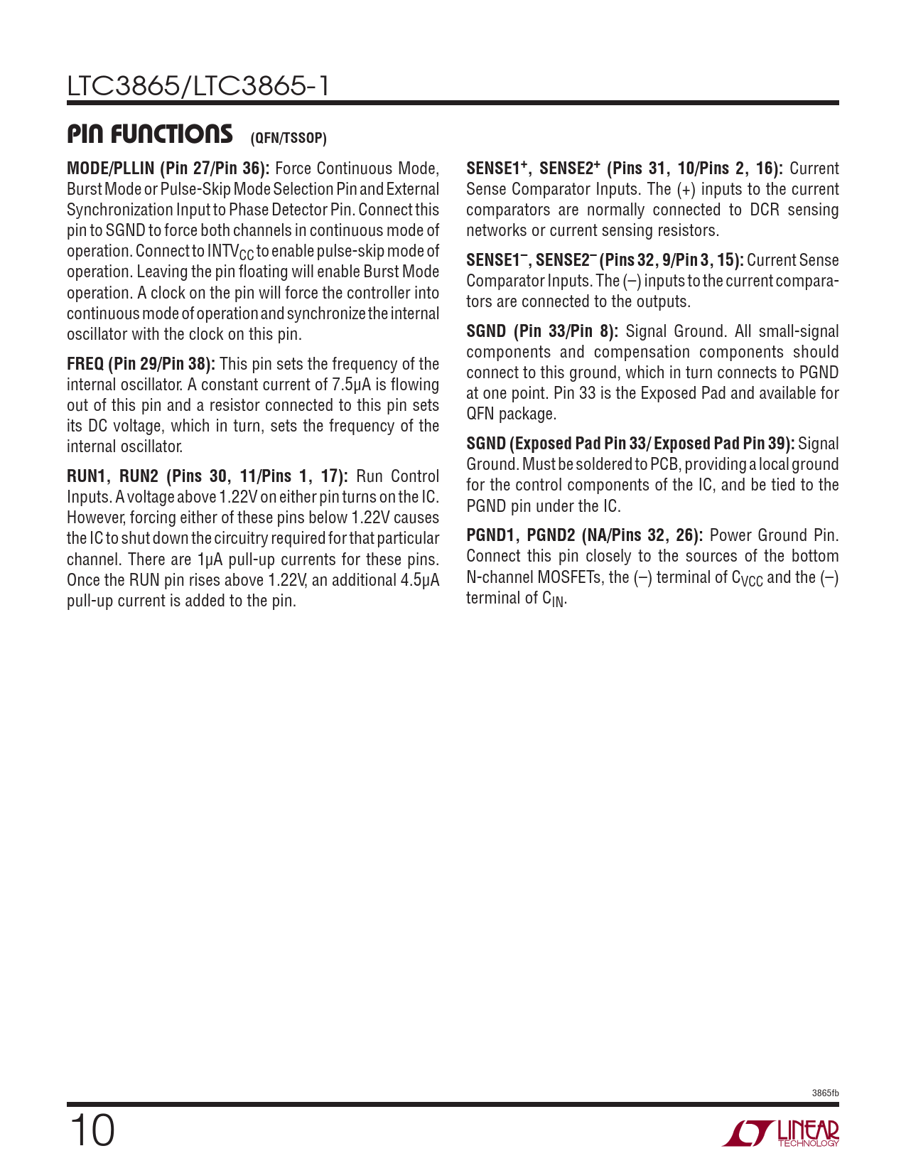 LTC3865/LTC3865-1 PIN FUNCTIONS (QFN/TSSOP)MODE/PLLIN (Pin 27/Pin 36): Force Continuous Mode, SENSE1+, SENSE2+ (Pins 31, 10/Pins 2, 16): Current Burst Mode or Pulse-Skip Mode Selection Pin and External Sense Comparator Inputs. The (+) inputs to the current Synchronization Input to Phase Detector Pin. Connect this comparators are normally connected to DCR sensing pin to SGND to force both channels in continuous mode of networks or current sensing resistors. operation. Connect to INTVCC to enable pulse-skip mode of SENSE1–, SENSE2– (Pins 32, 9/Pin 3, 15): Current Sense operation. Leaving the pin fl oating will enable Burst Mode Comparator Inputs. The (–) inputs to the current compara- operation. A clock on the pin will force the controller into tors are connected to the outputs. continuous mode of operation and synchronize the internal oscillator with the clock on this pin. SGND (Pin 33/Pin 8): Signal Ground. All small-signal components and compensation components should FREQ (Pin 29/Pin 38): This pin sets the frequency of the connect to this ground, which in turn connects to PGND internal oscillator. A constant current of 7.5μA is fl owing at one point. Pin 33 is the Exposed Pad and available for out of this pin and a resistor connected to this pin sets QFN package. its DC voltage, which in turn, sets the frequency of the internal oscillator. SGND (Exposed Pad Pin 33/ Exposed Pad Pin 39): Signal Ground. Must be soldered to PCB, providing a local ground RUN1, RUN2 (Pins 30, 11/Pins 1, 17): Run Control for the control components of the IC, and be tied to the Inputs. A voltage above 1.22V on either pin turns on the IC. PGND pin under the IC. However, forcing either of these pins below 1.22V causes the IC to shut down the circuitry required for that particular PGND1, PGND2 (NA/Pins 32, 26): Power Ground Pin. channel. There are 1μA pull-up currents for these pins. Connect this pin closely to the sources of the bottom Once the RUN pin rises above 1.22V, an additional 4.5μA N-channel MOSFETs, the (–) terminal of CVCC and the (–) pull-up current is added to the pin. terminal of CIN. 3865fb 10