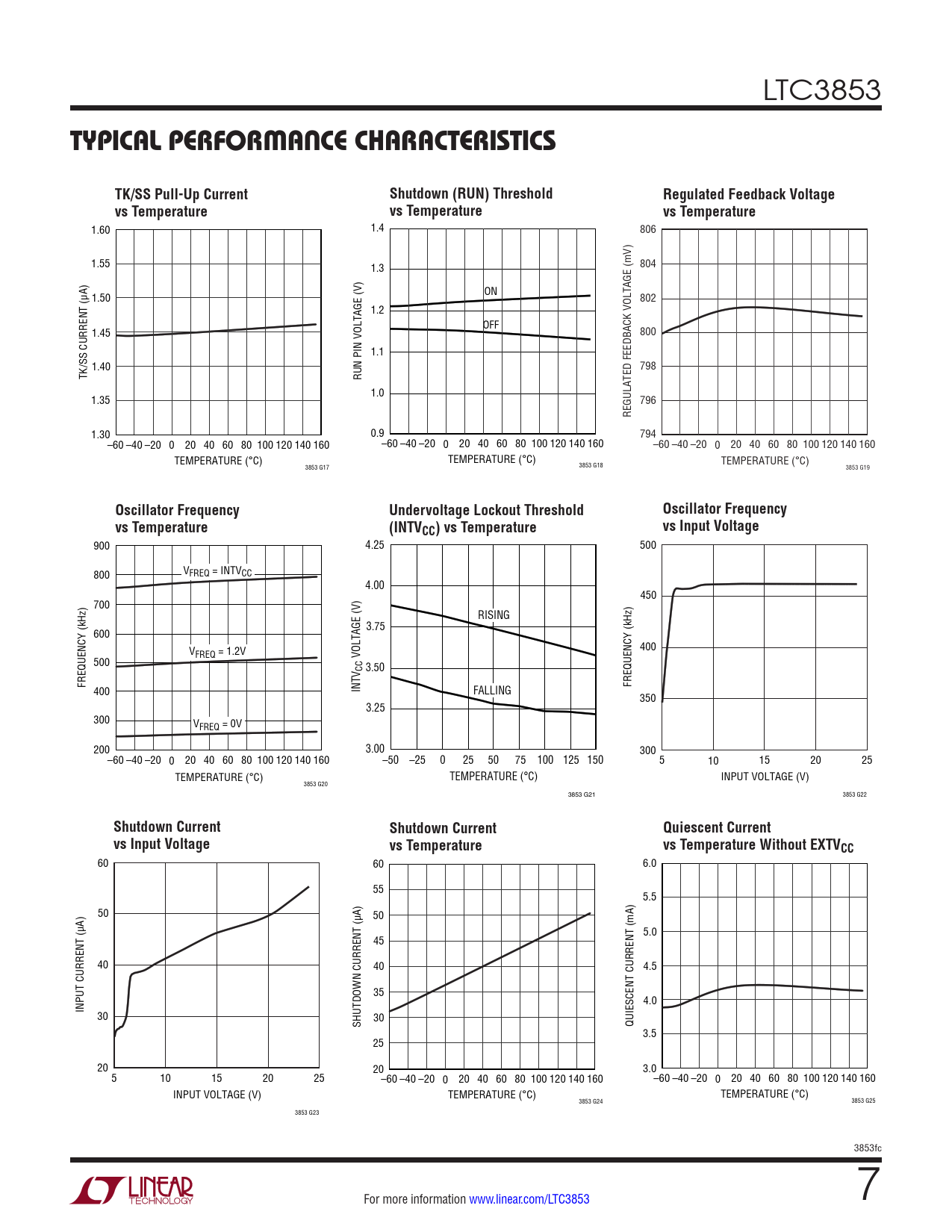 900 4.25 500 800 VFREQ = INTVCC 4.00 450 700 RISING 3.75 600 V 400 FREQ = 1.2V 500 VOLTAGE (V) CC 3.50 FREQUENCY (kHz) FREQUENCY (kHz) 400 INTV FALLING 350 3.25 300 VFREQ = 0V 200 3.00 300 –60 –40 –20 0 20 40 60 80 100 120 140 160 –50 –25 0 25 50 75 100 125 150 5 10 15 20 25 TEMPERATURE (°C) TEMPERATURE (°C) INPUT VOLTAGE (V) 3853 G20 3853 G21 3853 G22