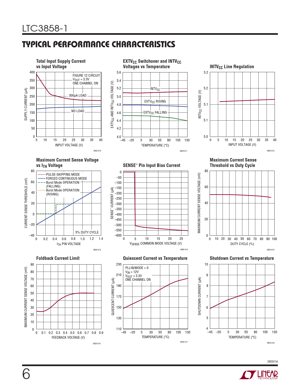 400 5.6 5.2 FIGURE 12 CIRCUIT 350 VOUT = 3.3V 5.4 ONE CHANNEL ON 300 5.2 INTVCC 5.2 250 300μA LOAD 5.0 VOLTAGE (V) CC EXTVCC RISING 200 4.8 5.1 VOLTAGE (V) NO LOAD 150 CC 4.6 EXTVCC FALLING AND INTV INTV SUPPLY CURRENT (μA) 100 CC 4.4 5.1 50 EXTV 4.2 0 4.0 5.0 5 10 15 20 25 30 35 40 –45 –20 5 30 55 80 105 130 0 5 10 15 20 25 30 35 40 INPUT VOLTAGE (V) TEMPERATURE (°C) INPUT VOLTAGE (V) 3858 G10 3858 G11 3858 G12