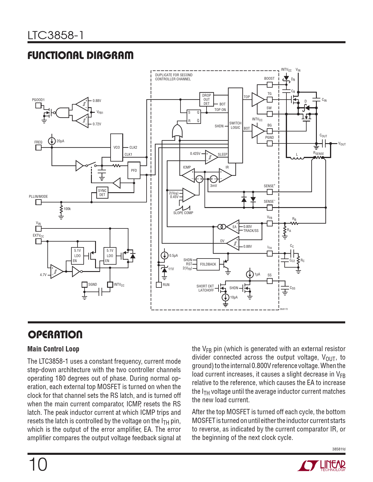 LTC3858-1 FUNCTIONAL DIAGRAM INTVCC VIN DUPLICATE FOR SECOND CONTROLLER CHANNEL BOOST DB CB TG DROP TOP PGOOD1 + OUT C 0.88V IN D DET BOT – SW TOP ON VFB1 S Q + INTVCC R – Q 0.72V SWITCH BG SHDN LOGIC BOT C PGND OUT FREQ 20μA VOUT VCO CLK2 + R 0.425V SENSE CLK1 SLEEP L – ICMP IR + + PFD – – – + + – 3mV SENSE+ SYNC 2(VFB) PLLIN/MODE DET 0.45V SENSE– 100k SLOPE COMP VFB R + B VIN EA – 0.80V R TRACK/SS A EXTVCC + OV – C 0.88V C ITH 5.1V 5.1V LDO LDO 0.5μA SHDN C R EN EN C2 C RST FOLDBACK + 11V 2(VFB) – 4.7V 1μA SS SGND INTVCC RUN SHORT CKT SHDN CSS LATCHOFF 10μA 38581 FD OPERATIONMain Control Loop the VFB pin (which is generated with an external resistor divider connected across the output voltage, V The LTC3858-1 uses a constant frequency, current mode OUT , to ground) to the internal 0.800V reference voltage. When the step-down architecture with the two controller channels load current increases, it causes a slight decrease in V operating 180 degrees out of phase. During normal op- FB relative to the reference, which causes the EA to increase eration, each external top MOSFET is turned on when the the I clock for that channel sets the RS latch, and is turned off TH voltage until the average inductor current matches the new load current. when the main current comparator, ICMP, resets the RS latch. The peak inductor current at which ICMP trips and After the top MOSFET is turned off each cycle, the bottom resets the latch is controlled by the voltage on the ITH pin, MOSFET is turned on until either the inductor current starts which is the output of the error amplifi er, EA. The error to reverse, as indicated by the current comparator IR, or amplifi er compares the output voltage feedback signal at the beginning of the next clock cycle. 38581fd 10