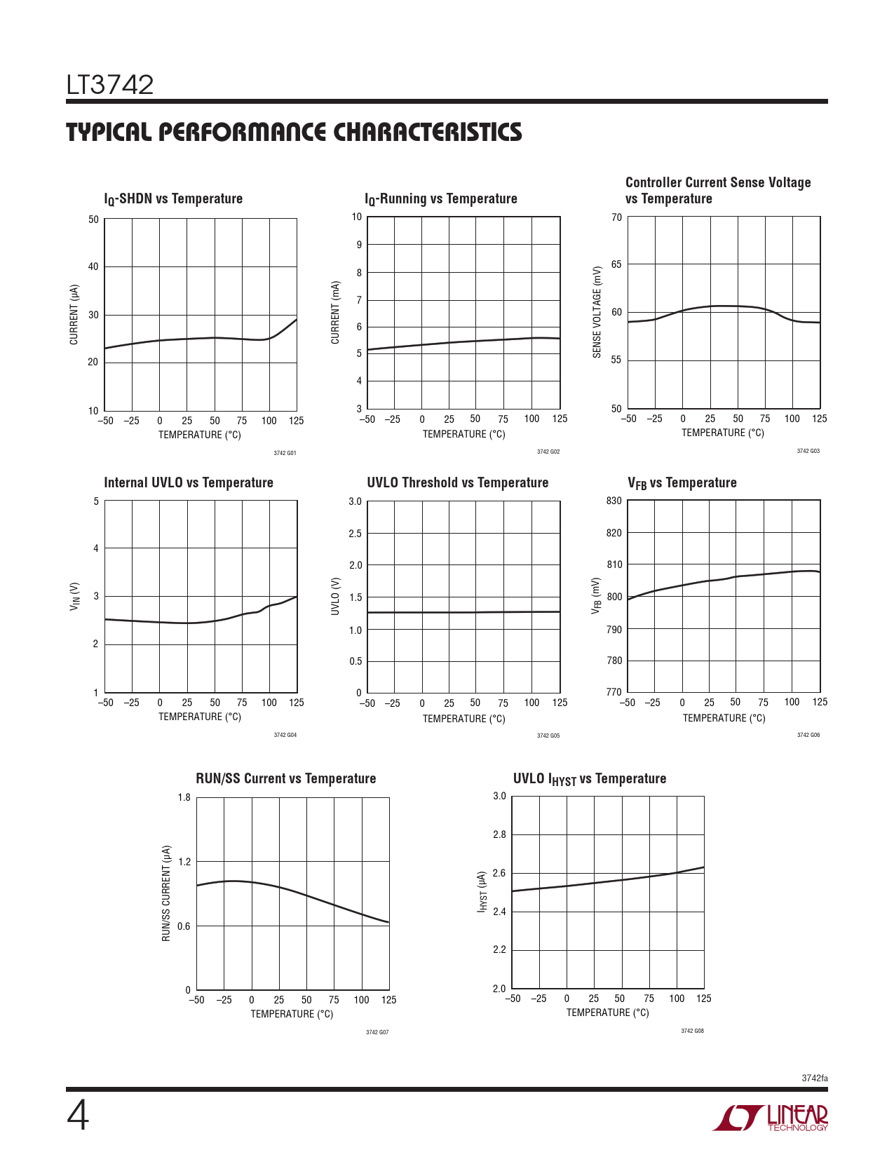 5 3.0 830 2.5 820 4 2.0 810 (V) 3 1.5 (mV) 800 V IN UVLO (V) V FB 1.0 790 2 0.5 780 1 0 770 –50 –25 0 25 50 75 100 125 –50 –25 0 25 50 75 100 125 –50 –25 0 25 50 75 100 125 TEMPERATURE (°C) TEMPERATURE (°C) TEMPERATURE (°C) 3742 G04 3742 G05 3742 G06