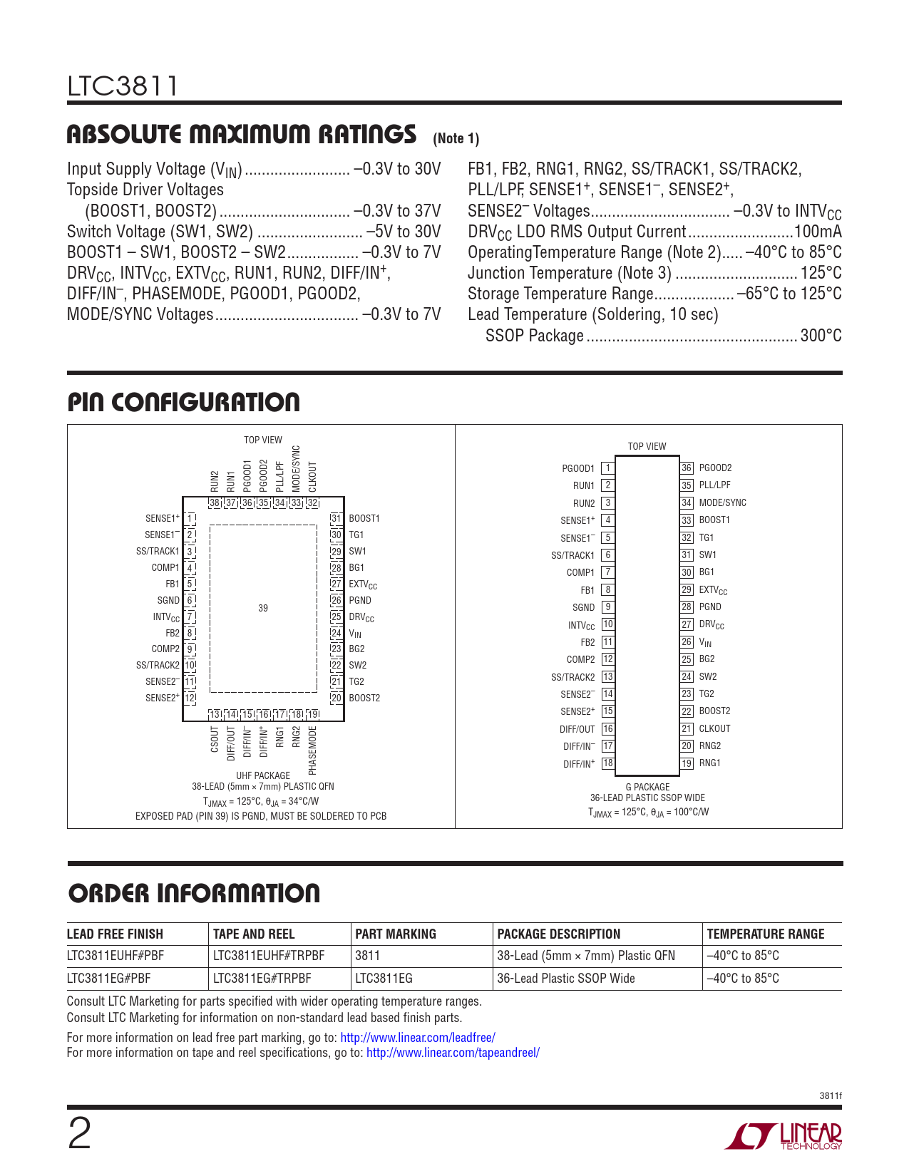 LTC3811EUHF#PBF LTC3811EUHF#TRPBF 3811 38-Lead (5mm × 7mm) Plastic QFN –40°C to 85°C LTC3811EG#PBF LTC3811EG#TRPBF LTC3811EG 36-Lead Plastic SSOP Wide –40°C to 85°C Consult LTC Marketing for parts specifi ed with wider operating temperature ranges. Consult LTC Marketing for information on non-standard lead based fi nish parts. For more information on lead free part marking, go to: http://www.linear.com/leadfree/ For more information on tape and reel specifi cations, go to: http://www.linear.com/tapeandreel/ 3811f 2