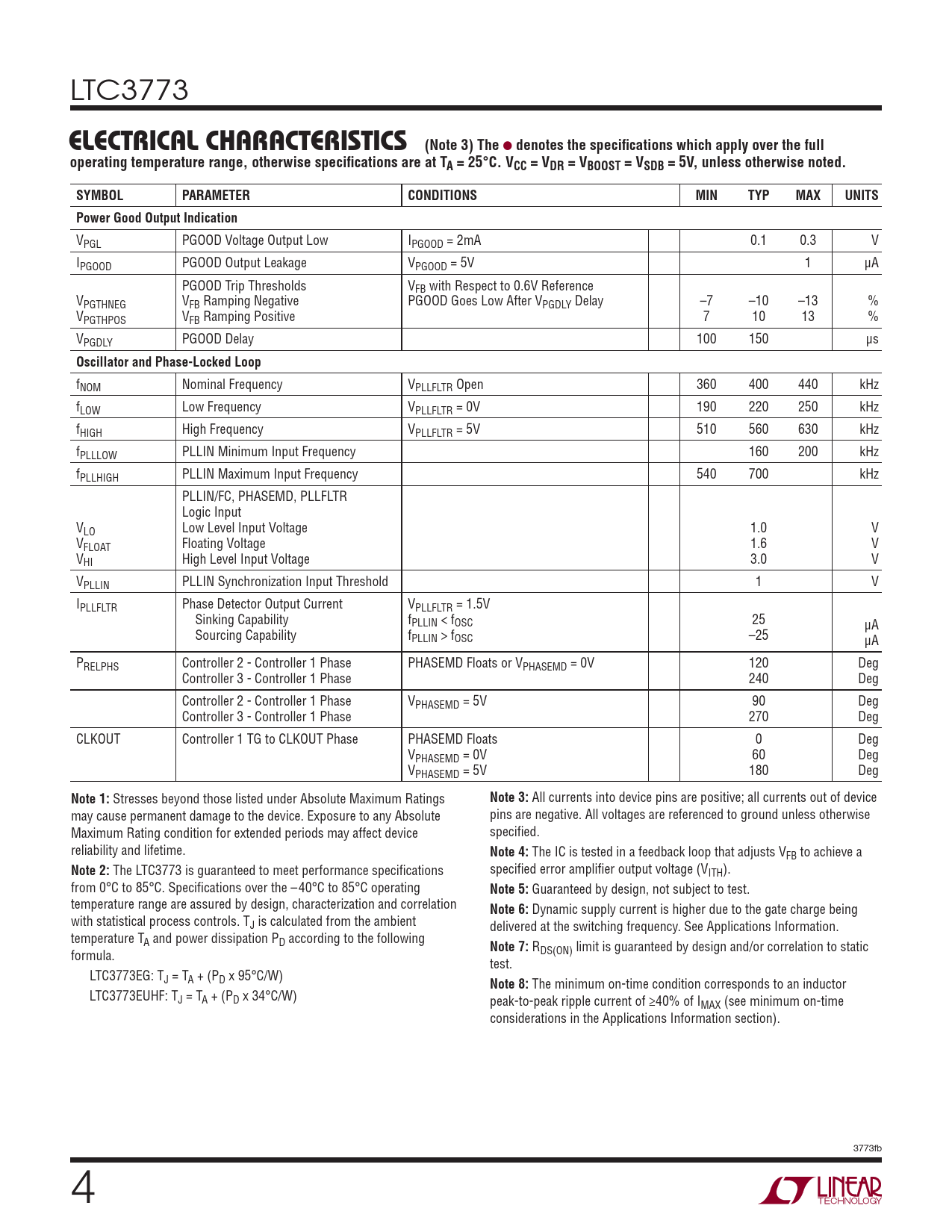 LTC3773 ELECTRICAL CHARACTERISTICS (Note 3) The ● denotes the specifi cations which apply over the fulloperating temperature range, otherwise specifi cations are at TA = 25°C. VCC = VDR = VBOOST = VSDB = 5V, unless otherwise noted.SYMBOLPARAMETERCONDITIONSMINTYPMAXUNITSPower Good Output Indication VPGL PGOOD Voltage Output Low IPGOOD = 2mA 0.1 0.3 V IPGOOD PGOOD Output Leakage VPGOOD = 5V 1 μA PGOOD Trip Thresholds VFB with Respect to 0.6V Reference VPGTHNEG VFB Ramping Negative PGOOD Goes Low After VPGDLY Delay –7 –10 –13 % VPGTHPOS VFB Ramping Positive 7 10 13 % VPGDLY PGOOD Delay 100 150 μs Oscillator and Phase-Locked Loop fNOM Nominal Frequency VPLLFLTR Open 360 400 440 kHz fLOW Low Frequency VPLLFLTR = 0V 190 220 250 kHz fHIGH High Frequency VPLLFLTR = 5V 510 560 630 kHz fPLLLOW PLLIN Minimum Input Frequency 160 200 kHz fPLLHIGH PLLIN Maximum Input Frequency 540 700 kHz PLLIN/FC, PHASEMD, PLLFLTR Logic Input VLO Low Level Input Voltage 1.0 V VFLOAT Floating Voltage 1.6 V VHI High Level Input Voltage 3.0 V VPLLIN PLLIN Synchronization Input Threshold 1 V IPLLFLTR Phase Detector Output Current VPLLFLTR = 1.5V Sinking Capability fPLLIN < fOSC 25 μA Sourcing Capability fPLLIN > fOSC –25 μA PRELPHS Controller 2 - Controller 1 Phase PHASEMD Floats or VPHASEMD = 0V 120 Deg Controller 3 - Controller 1 Phase 240 Deg Controller 2 - Controller 1 Phase VPHASEMD = 5V 90 Deg Controller 3 - Controller 1 Phase 270 Deg CLKOUT Controller 1 TG to CLKOUT Phase PHASEMD Floats 0 Deg VPHASEMD = 0V 60 Deg VPHASEMD = 5V 180 Deg Note 1: Stresses beyond those listed under Absolute Maximum Ratings Note 3: All currents into device pins are positive; all currents out of device may cause permanent damage to the device. Exposure to any Absolute pins are negative. All voltages are referenced to ground unless otherwise Maximum Rating condition for extended periods may affect device specifi ed. reliability and lifetime. Note 4: The IC is tested in a feedback loop that adjusts VFB to achieve a Note 2: The LTC3773 is guaranteed to meet performance specifi cations specifi ed error amplifi er output voltage (VITH). from 0°C to 85°C. Specifi cations over the – 40°C to 85°C operating Note 5: Guaranteed by design, not subject to test. temperature range are assured by design, characterization and correlation Note 6: Dynamic supply current is higher due to the gate charge being with statistical process controls. TJ is calculated from the ambient delivered at the switching frequency. See Applications Information. temperature TA and power dissipation PD according to the following Note 7: R formula. DS(ON) limit is guaranteed by design and/or correlation to static test. LTC3773EG: TJ = TA + (PD x 95°C/W) Note 8: The minimum on-time condition corresponds to an inductor LTC3773EUHF: TJ = TA + (PD x 34°C/W) peak-to-peak ripple current of ≥40% of IMAX (see minimum on-time considerations in the Applications Information section). 3773fb 4