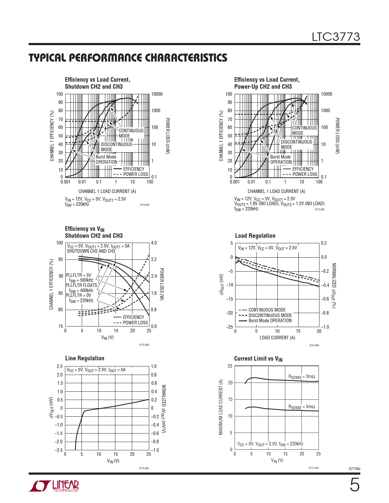 100 4.0 5 0.2 VCC = 5V, VOUT1 = 2.5V, IOUT1 = 5A VIN = 12V, VCC = 5V, VOUT = 2.5V SHUTDOWN CH2 AND CH3 0 0.0 95 3.2 NORMALIZED POWER LOSS (W) –5 –0.2 90 PLLFLTR = 5V 2.4 fSW = 560kHz (mV) PLLFLTR FLOATS –10 –0.4 Δ f V 85 SW = 400kHz 1.6 ΔV OUT OUT PLLFLTR = 0V –15 –0.6 f (%) SW = 220kHz CHANNEL 1 EFFICIENCY (%) 80 0.8 CONTINUOUS MODE –20 –0.8 DISCONTINUOUS MODE EFFICIENCY Burst Mode OPERATION POWER LOSS 75 0.0 –25 –1.0 0 5 10 15 20 25 0 5 10 15 20 VIN (V) LOAD CURRENT (A) 3773 G03 3773 G04