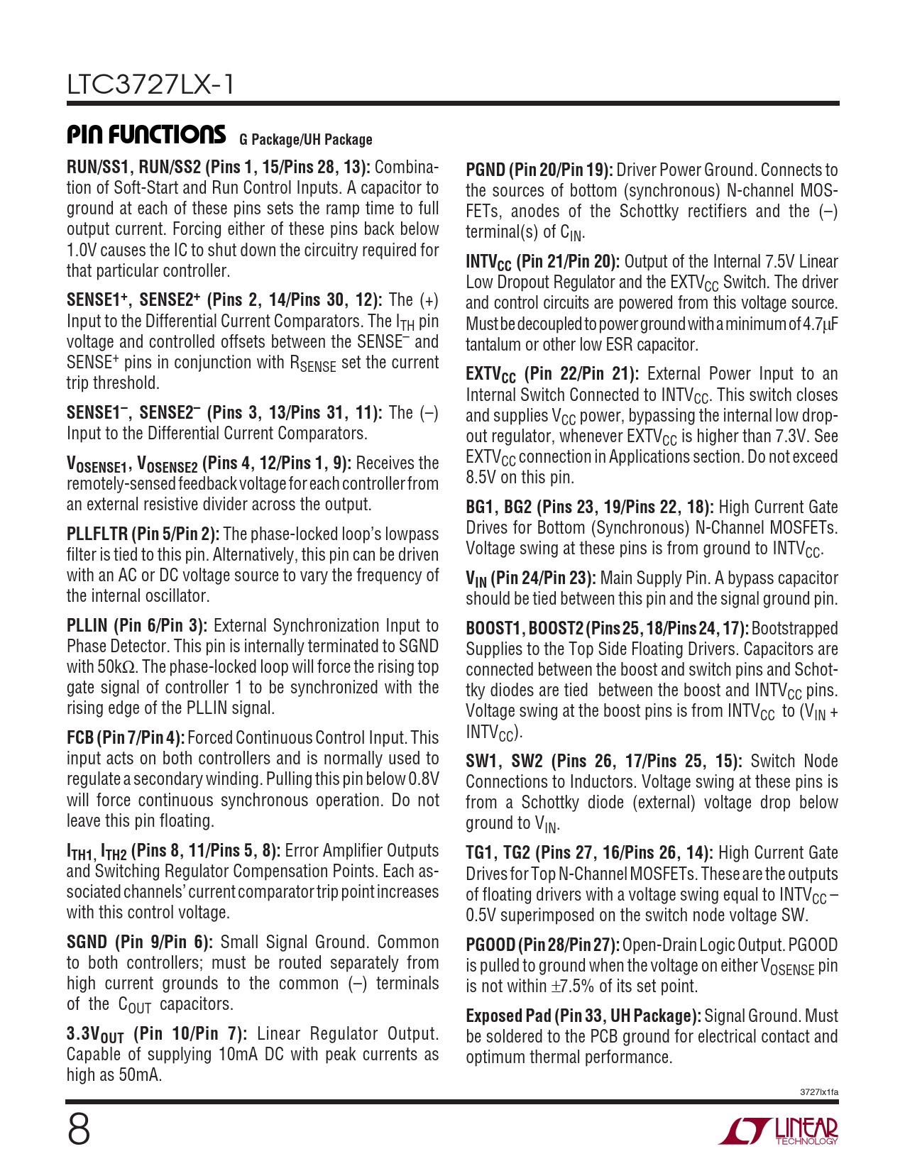LTC3727LX-1 UUUPI FU CTIO S G Package/UH Package RUN/SS1, RUN/SS2 (Pins 1, 15/Pins 28, 13): Combina- PGND (Pin 20/Pin 19): Driver Power Ground. Connects to tion of Soft-Start and Run Control Inputs. A capacitor to the sources of bottom (synchronous) N-channel MOS- ground at each of these pins sets the ramp time to full FETs, anodes of the Schottky rectifiers and the (–) output current. Forcing either of these pins back below terminal(s) of CIN. 1.0V causes the IC to shut down the circuitry required for INTV that particular controller. CC (Pin 21/Pin 20): Output of the Internal 7.5V Linear Low Dropout Regulator and the EXTVCC Switch. The driver SENSE1+, SENSE2+ (Pins 2, 14/Pins 30, 12): The (+) and control circuits are powered from this voltage source. Input to the Differential Current Comparators. The ITH pin Must be decoupled to power ground with a minimum of 4.7µF voltage and controlled offsets between the SENSE– and tantalum or other low ESR capacitor. SENSE+ pins in conjunction with RSENSE set the current EXTV trip threshold. CC (Pin 22/Pin 21): External Power Input to an Internal Switch Connected to INTVCC. This switch closes SENSE1–, SENSE2– (Pins 3, 13/Pins 31, 11): The (–) and supplies VCC power, bypassing the internal low drop- Input to the Differential Current Comparators. out regulator, whenever EXTVCC is higher than 7.3V. See V EXTV OSENSE1, VOSENSE2 (Pins 4, 12/Pins 1, 9): Receives the CC connection in Applications section. Do not exceed remotely-sensed feedback voltage for each controller from 8.5V on this pin. an external resistive divider across the output. BG1, BG2 (Pins 23, 19/Pins 22, 18): High Current Gate PLLFLTR (Pin 5/Pin 2): The phase-locked loop’s lowpass Drives for Bottom (Synchronous) N-Channel MOSFETs. filter is tied to this pin. Alternatively, this pin can be driven Voltage swing at these pins is from ground to INTVCC. with an AC or DC voltage source to vary the frequency of VIN (Pin 24/Pin 23): Main Supply Pin. A bypass capacitor the internal oscillator. should be tied between this pin and the signal ground pin. PLLIN (Pin 6/Pin 3): External Synchronization Input to BOOST1, BOOST2 (Pins 25, 18/Pins 24, 17): Bootstrapped Phase Detector. This pin is internally terminated to SGND Supplies to the Top Side Floating Drivers. Capacitors are with 50kΩ. The phase-locked loop will force the rising top connected between the boost and switch pins and Schot- gate signal of controller 1 to be synchronized with the tky diodes are tied between the boost and INTVCC pins. rising edge of the PLLIN signal. Voltage swing at the boost pins is from INTVCC to (VIN + FCB (Pin 7/Pin 4): Forced Continuous Control Input. This INTVCC). input acts on both controllers and is normally used to SW1, SW2 (Pins 26, 17/Pins 25, 15): Switch Node regulate a secondary winding. Pulling this pin below 0.8V Connections to Inductors. Voltage swing at these pins is will force continuous synchronous operation. Do not from a Schottky diode (external) voltage drop below leave this pin floating. ground to VIN. ITH1, ITH2 (Pins 8, 11/Pins 5, 8): Error Amplifier Outputs TG1, TG2 (Pins 27, 16/Pins 26, 14): High Current Gate and Switching Regulator Compensation Points. Each as- Drives for Top N-Channel MOSFETs. These are the outputs sociated channels’ current comparator trip point increases of floating drivers with a voltage swing equal to INTVCC – with this control voltage. 0.5V superimposed on the switch node voltage SW. SGND (Pin 9/Pin 6): Small Signal Ground. Common PGOOD (Pin 28/Pin 27): Open-Drain Logic Output. PGOOD to both controllers; must be routed separately from is pulled to ground when the voltage on either VOSENSE pin high current grounds to the common (–) terminals is not within ±7.5% of its set point. of the COUT capacitors. Exposed Pad (Pin 33, UH Package): Signal Ground. Must 3.3VOUT (Pin 10/Pin 7): Linear Regulator Output. be soldered to the PCB ground for electrical contact and Capable of supplying 10mA DC with peak currents as optimum thermal performance. high as 50mA. 3727lx1fa 8