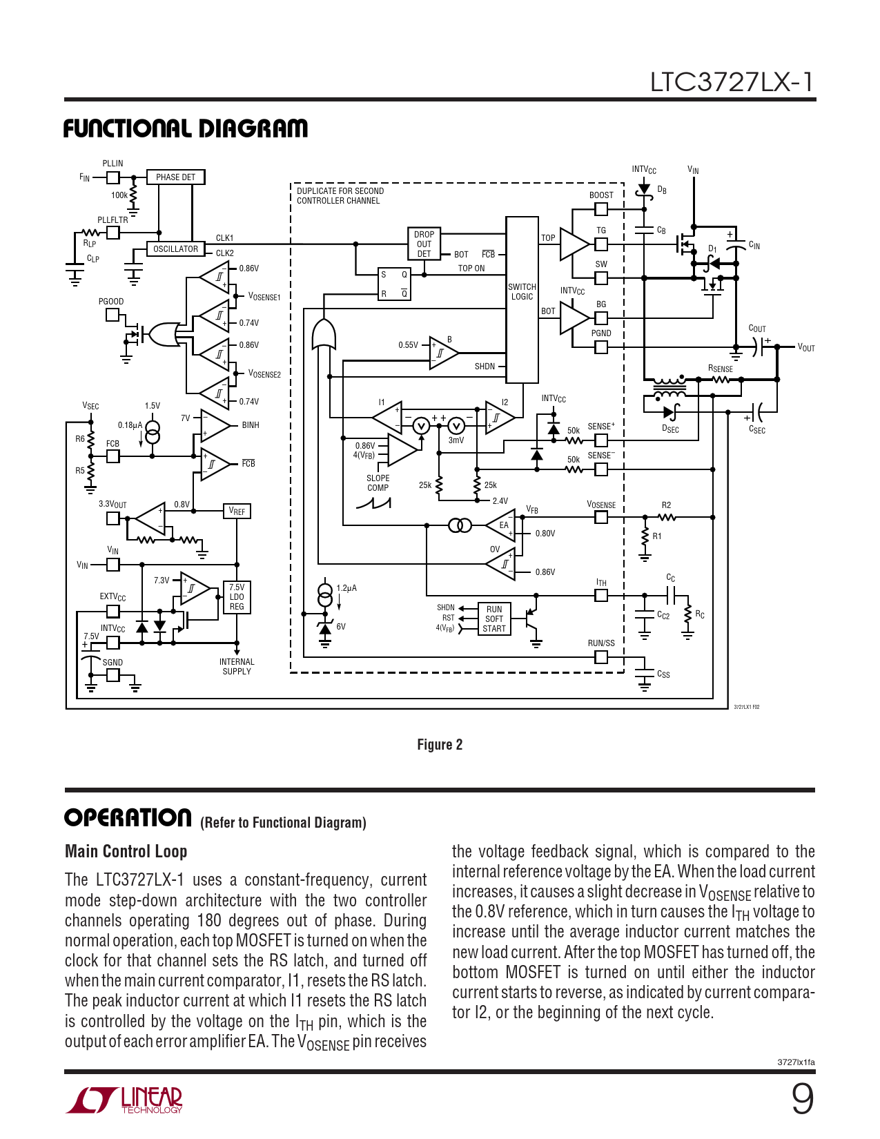 LTC3727LX-1 UUWFU CTIO AL DIAGRA PLLIN INTVCC VIN FIN PHASE DET D DUPLICATE FOR SECOND B 100k BOOST CONTROLLER CHANNEL PLLFLTR TG CB CLK1 DROP TOP + RLP OUT CIN OSCILLATOR D CLK2 1 DET C BOT FCB LP SW – 0.86V TOP ON S Q + SWITCH INTVCC V R Q OSENSE1 LOGIC PGOOD BG – BOT + 0.74V C PGND OUT+ B – 0.86V 0.55V + VOUT + – SHDN RSENSE VOSENSE2 – INTV + CC V 0.74V I1 I2 SEC 1.5V + – 7V – – + + – + 0.18µA BINH – + SENSE+ D 50k SEC C + SEC R6 FCB 3mV 0.86V + 4(VFB) SENSE– 50k FCB R5 – SLOPE COMP 25k 25k 3.3V 2.4V OUT 0.8V VOSENSE R2 + V V REF FB – – EA + 0.80V R1 VIN OV + VIN – 0.86V 7.3V + C I C 7.5V TH 1.2µA EXTV – CC LDO REG SHDN RUN C R RST SOFT C2 C INTVCC 6V 4(VFB) START 7.5V + RUN/SS SGND INTERNAL SUPPLY CSS 3727LX1 F02 Figure 2UOPERATIO (Refer to Functional Diagram)Main Control Loop the voltage feedback signal, which is compared to the internal reference voltage by the EA. When the load current The LTC3727LX-1 uses a constant-frequency, current increases, it causes a slight decrease in V mode step-down architecture with the two controller OSENSE relative to the 0.8V reference, which in turn causes the I channels operating 180 degrees out of phase. During TH voltage to increase until the average inductor current matches the normal operation, each top MOSFET is turned on when the new load current. After the top MOSFET has turned off, the clock for that channel sets the RS latch, and turned off bottom MOSFET is turned on until either the inductor when the main current comparator, I1, resets the RS latch. current starts to reverse, as indicated by current compara- The peak inductor current at which I1 resets the RS latch tor I2, or the beginning of the next cycle. is controlled by the voltage on the ITH pin, which is the output of each error amplifier EA. The VOSENSE pin receives 3727lx1fa 9