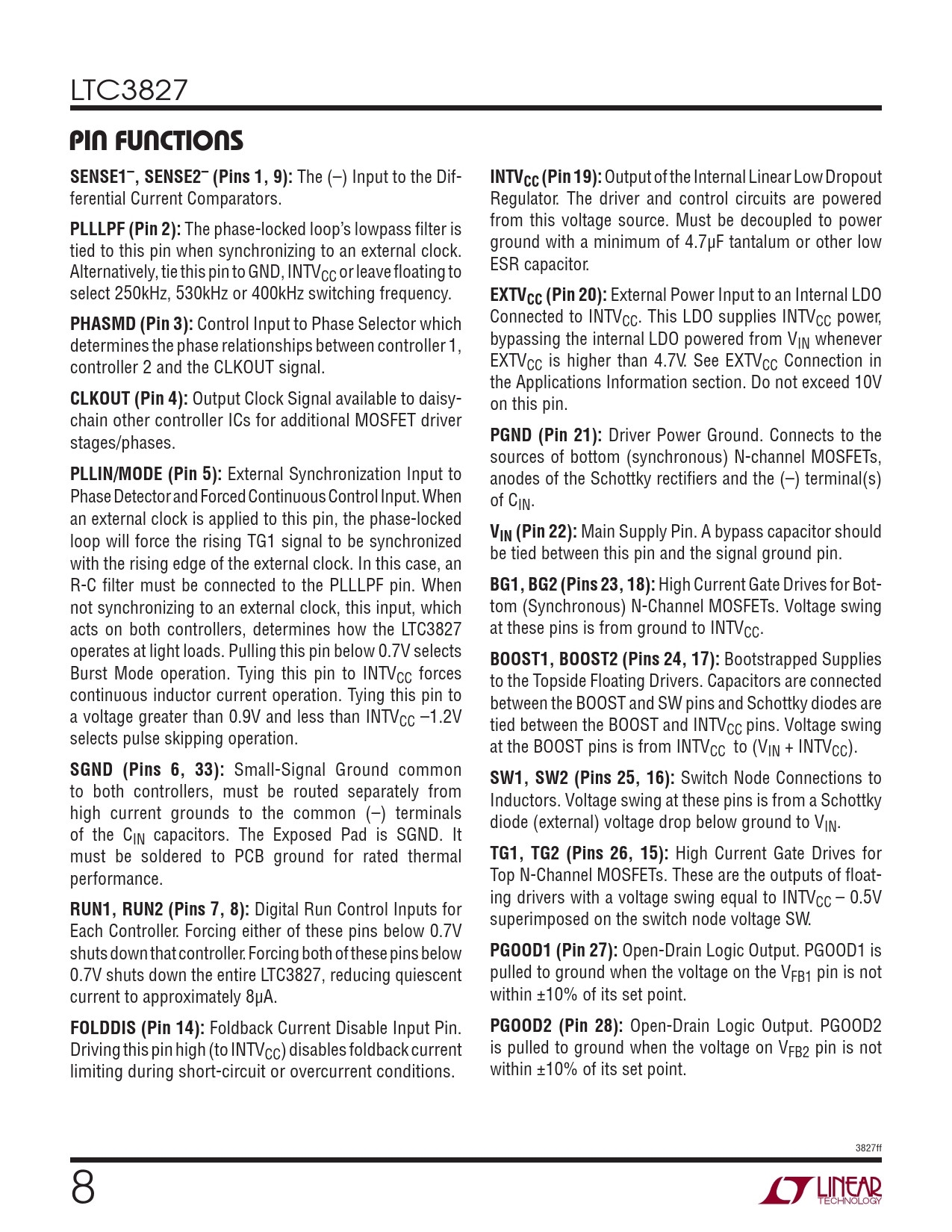 PIN FUNCTIONS SENSE1–, SENSE2– (Pins 1, 9): INTVCC (Pin 19): PLLLPF (Pin 2): EXTVCC (Pin 20): PHASMD (Pin 3): CLKOUT (Pin 4):