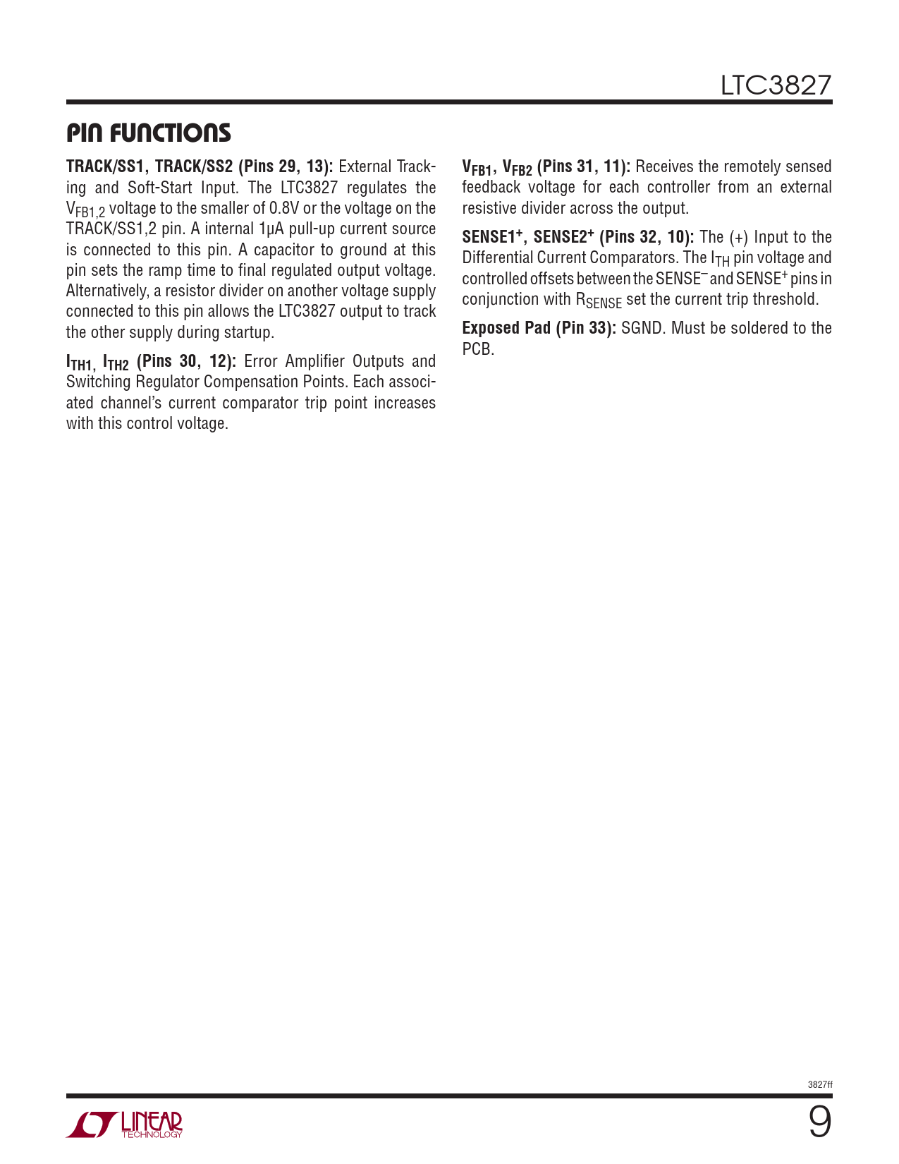 PIN FUNCTIONS TRACK/SS1, TRACK/SS2 (Pins 29, 13): VFB1, VFB2 (Pins 31, 11): SENSE1+, SENSE2+ (Pins 32, 10):