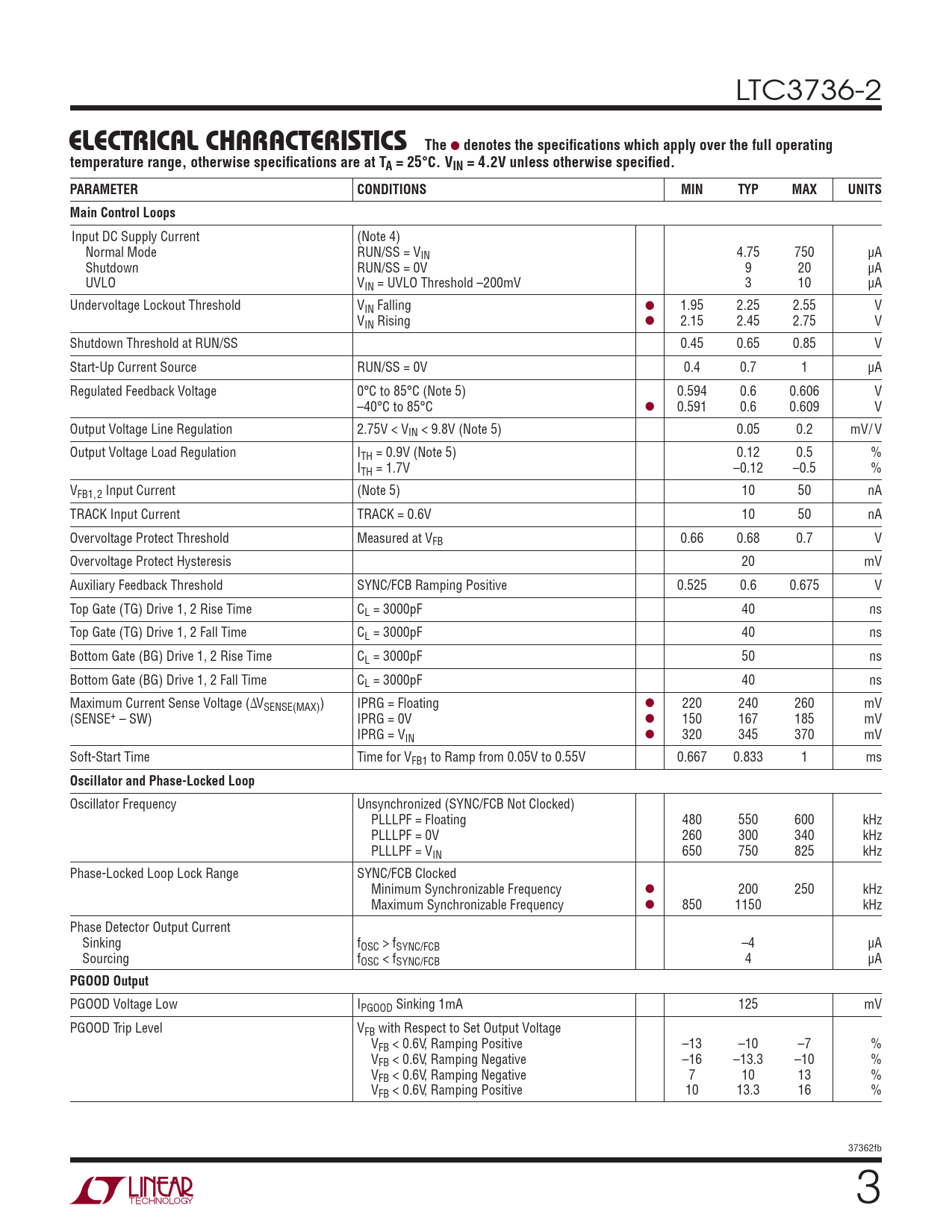 PGOOD Voltage Low IPGOOD Sinking 1mA 125 mV PGOOD Trip Level VFB with Respect to Set Output Voltage VFB < 0.6V, Ramping Positive –13 –10 –7 % VFB < 0.6V, Ramping Negative –16 –13.3 –10 % VFB < 0.6V, Ramping Negative 7 10 13 % VFB < 0.6V, Ramping Positive 10 13.3 16 % 37362fb 3